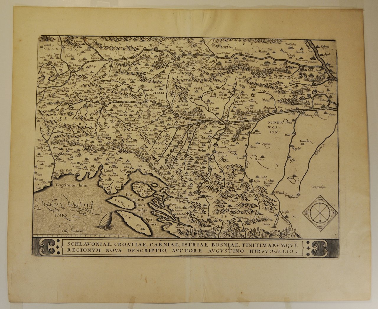 Incisione all'acquaforte di mm 460 x 344 su carta di filo. Foglio a larghi margini in perfetto stato di conservazione. Numerosissimi toponimi nella pianta in tedesco ed in sloveno. Si tratta del foglio n 88 del più che celebre atlante di Ortelio Theatrum orbis terrarum. Abramo Ortelio: nome italianizzato del geografo e cartografo fiammingo Abraham Oertel (Anversa, 2 aprile 1527 – 28 giugno 1598). Ortelius fu il grande fondatore della cartografia fiamminga con Mercatore, nome italianizzato di Gerardus Mercator, il cartografo e geografo fiammingo Gerhard Kremer (Rupelmonde 1512-Duisburg 1594). Dopo avere studiato greco, latino e matematica, Oertel si stabilì ad Anversa - il grande porto delle Diciassette Province - come libraio e cartografo. Viaggiò molto e pubblicò in 1564 una carta del mondo in 8 fogli che conobbe un grande successo. Il suo modo di lavorare era sensibilmente differente del suo rivale e amico Mercatore: Ortelius redigeva le carte per mezzo dei suoi contatti professionali o amichevoli con i cartografi europei. Nel 1564 pubblicò una carta del mondo (Typus Orbis Terrarum) in otto fogli. Venticinque anni prima dell'atlante di Mercatore, fece incidere da Franz Hogenberg la sua collezione di carte in una stessa scala (1570) che fu pubblicata sotto il titolo di Theatrum Orbis Terrarum che costituisce in effetti il primo atlante, una pubblicazione che conobbe quattro ristampe nei suoi primi dieci anni dall'uscita. In totale, il Theatrum fu pubblicato in sette lingue e trentasei edizioni. Ortelius fu anche il primo a citare le sue fonti per le carte, menzionando i nomi dei cartografi all'origine delle notizie cartografiche. Ortelius pubblicò inoltre parecchie carte storiche, alcune delle quali furono inglobate nel Theatrum. Tra 1579 e 1606 fu pubblicato il suo Parergon Theatri, contenente una riproduzione della Tabula Peutingeriana, nome latino dato a una copia del sec. XII o XIII su rotolo pergamenaceo lungo 6,80 m di un antico itinerario figurato a colori dell'Impero romano conservata alla Biblioteca Nazionale di Vienna e che trae il nome dall'umanista tedesco Konrad Peutinger (Augusta 1465-1547) che la pubblicò parzialmente. Nel 1570 Ortelius ottenne il monopolio per gli atlanti, il che impedì in particolare a Gerardo di Jode, che aveva pubblicato la carta del mondo nel 1564, di pubblicare il proprio atlante prima del 1578.