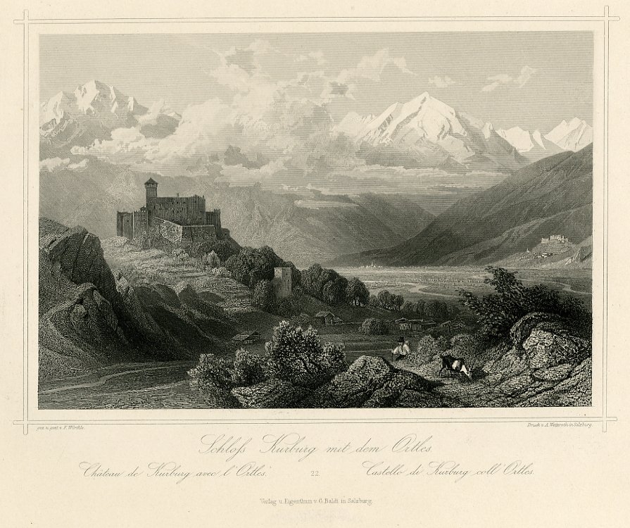 Incisione su acciaio di dimensioni 140x205 mm. Condizioni : USATO - Stato : Buono, ordinari segni d'uso e del tempo. Altre note : Veduta del castello di Churburg (o Castel Coira), presso Sluderno (Schludern) in Val Venosta. Il castello, tuttora ben conservato, è proprietà della famiglia Trapp sin dal XVI secolo. Nominato per la prima volta nel 1259, Churburg fu soggetto a diverse riedificazioni in stile gotico prima e rinascimentale poi. Qui è rappresentato sulla sinistra, mentre sullo sfondo si staglia il gruppo dell'Ortles.
