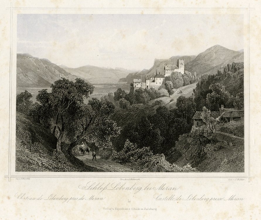 Incisione su acciaio di dimensioni 142x200 mm. Condizioni : USATO - Stato : Buono, ordinari segni d'uso e del tempo. Lievi segni di foxing. Altre note : Veduta di Castel Lebenberg o Monteleone in val Passiria (Passeiertal). L'edificio è una delle più belle tenute del Burgraviato, costruito nel XIII secolo dai Conti di Marlengo. La stampa si trova in "Malerische Ansichten von Süd u. Nord Tirol". L'incisore è J. Richter; l'autore è Friedrich Würthle (1820-1902), allievo di Karl Frommel e attivo a Salisburgo a partire dal 1860.