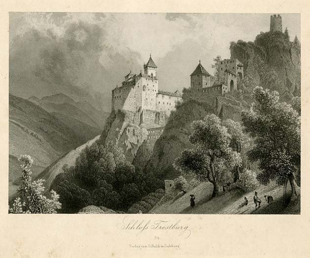 Incisione su acciaio di dimensioni 107x155 mm. Condizioni : USATO - Stato : Buono, ordinari segni d'uso e del tempo. Lievi segni di foxing. Altre note : Veduta raffigurante il castello di Trostburg (noto anche come Castel Forte), presso Ponte Gardena. Edificato nel XII secolo come castello ministeriale, fu poi ampliato nei secoli XIV e XV. Fu per 600 anni di proprietà dei conti Wolkenstein, acquistato poi dal Südtiroler Burgeninstitut è divenuto il Museo dei castelli dell'Alto Adige.