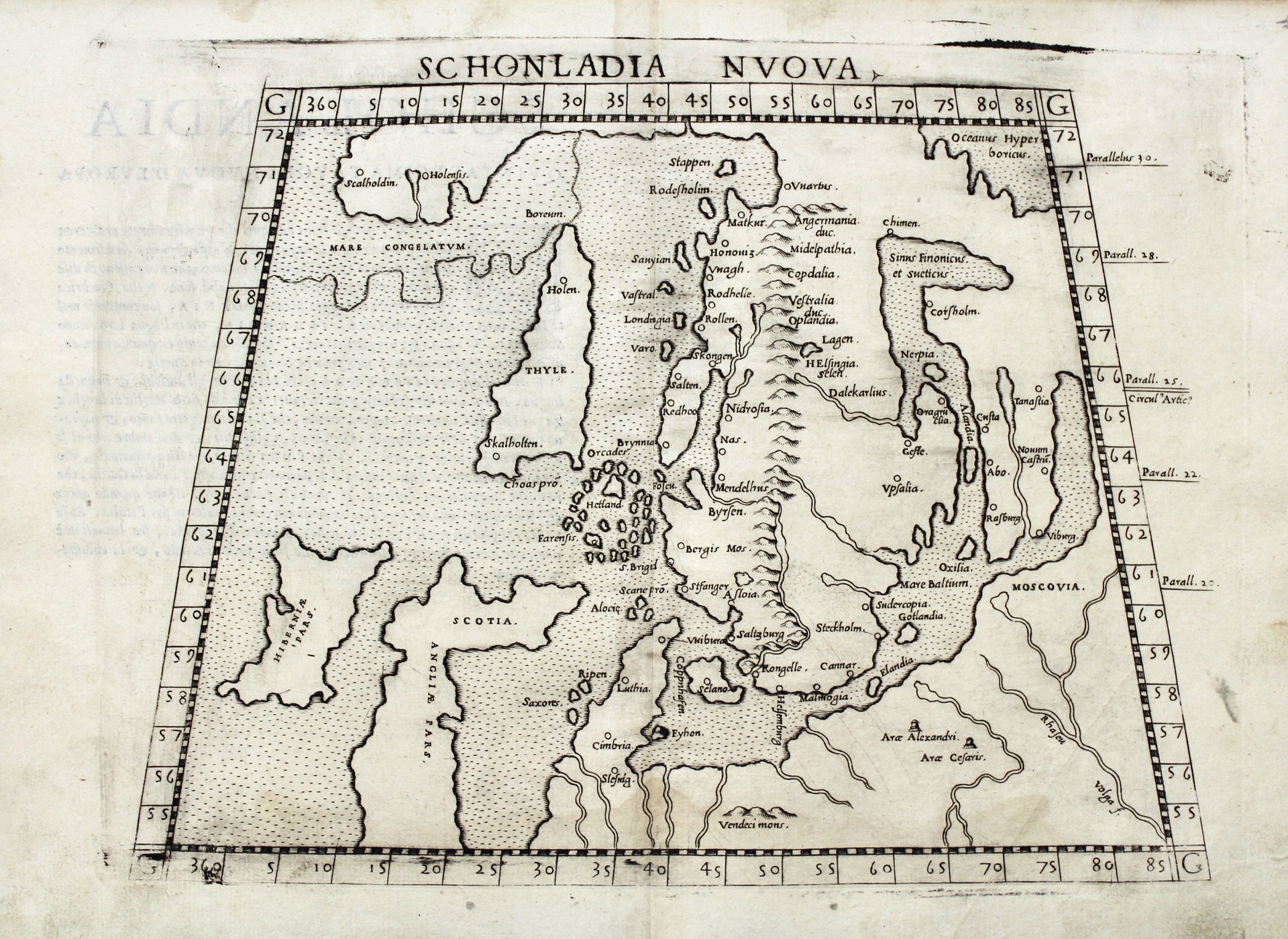 Incisione in rame, dipinta a mano, mm 193x263. Affascinante carta geografica raffigurante la Scandinavia Una delle prime carta raffiguranti il nord Europa, che combina conoscenze tolemaiche con informazioni cartografiche moderne. Da notare che la celebre mitica isola di Thule risulta più estesa dell'Irlanda.<BR>Tratta dall'edizione veneziana della "Geographia" di Tolomeo curata da Ruscelli. La carta è basata su quella di Gastaldi del 1548 pubblicata nella sua edizione della "Geografia" di qualche anno prima. <BR>Girolamo Ruscelli (1500-1566) nasce a Viterbo ed è un importante scrittore ed editore, che dopo aver studiato a Padova trascorse la propria carriera fra Roma e Napoli, dove morì. Tolomeo, il più grande cartografo dell'antichità, pubblicò La Geografia nel 150 d.C.; nel medioevo sopravvisse, grazie alla mediazione araba, manoscritta in greco e fu poi tradotta in latino da Jacopo D'Angelo; da inizio Quattrocento acquisì sempre più notorietà e nel 1477 fu pubblicata a Bologna la prima edizione illustrata a stampa comprendente solo carte del mondo antico, immediatamente seguita da altre edizioni nel 1478, -80, -82 che già presentavano alcune carte del mondo moderno. Con il susseguirsi delle edizioni, si incrementò il numero delle carte moderne consci che il mondo fosse ben diverso da quello di Tolomeo, fino a giungere alla celebre edizione del 1513 di Waldseemueller, il primo atlante moderno, composto da 20 carte nuove oltre alle antiche. Nel corso del XVI secolo ed oltre vennero poi editate numerose edizioni fra cui quelle curate da Ruscelli, le cui carte moderne sono quelle di Gastaldi del 1548 in versione ingrandita. Ottimo esemplare con interessante e curioso testo descrittivo in italiano al verso, ben contrastato ed impresso; lieve alone nella parte inferiore. Gisnberg, printed maps of Scandinavia, <BR><BR>