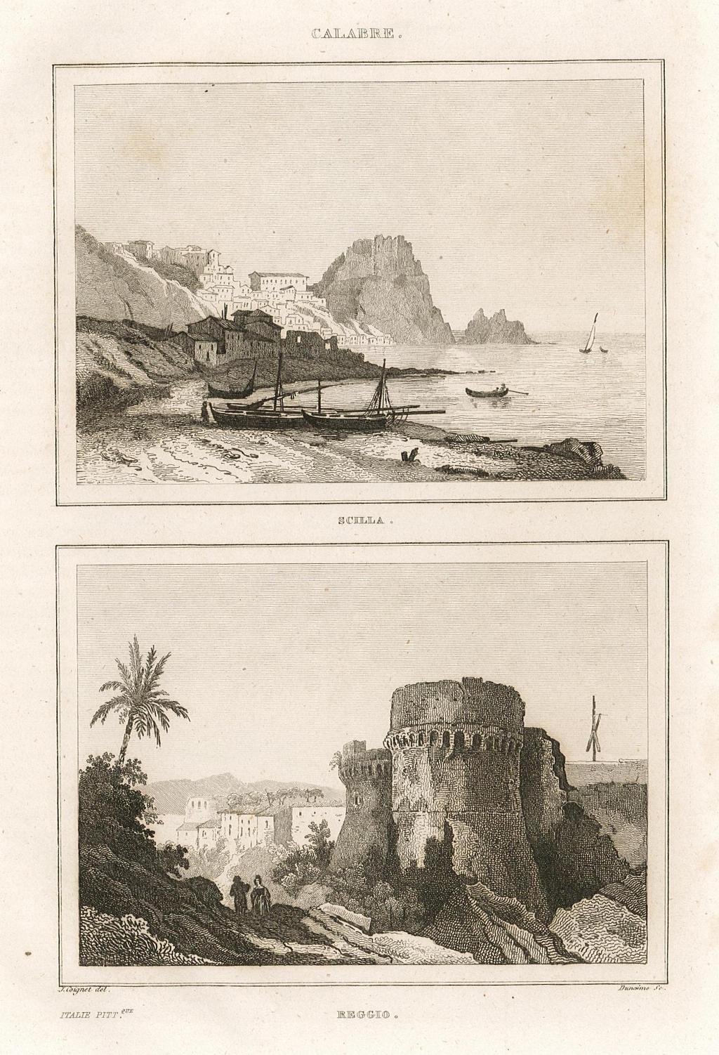 Stampa, antica ed originale, con due vedute in unico foglio. Autore: Coignet J. del. - Dunaime sc. Luogo: Scilla - Reggio Calabria. Anno: 1834/36. Tecnica: incisione in acciaio. Dimensioni: 195x129.