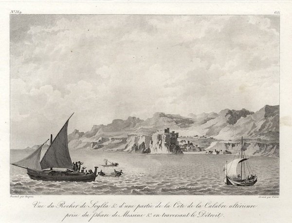 SCILLA – “Vue du Rochers de Scylla & d’une partie de la Côte de la Calabre ultérieure prise du phare de Messine” Animato scorcio dello Stretto di Messina