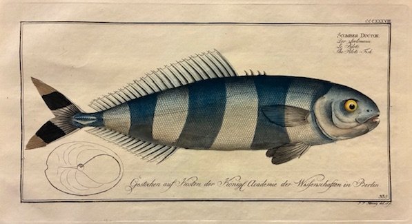 Incisione originale su rame (cm. 36x21,5 più ampi margini bianchi) di F.F. Hennig tratta dalla celebre opera ‘Allgemeine Naturgeschichte der Fische’. Carta vergellata con filigrana. Splendida coloritura coeva all’acquarello. Ottimo esemplare.