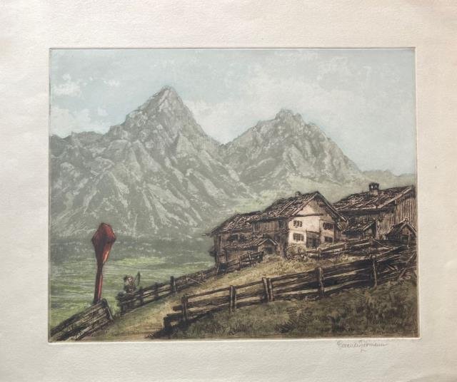 Acquaforte e puntasecca a colori, 1900 circa, cm 53 x 63 (al foglio), firmata in nero in lastra, e a lapis fuori dalla lastra, entrambe in basso a destra ed entrambe per esteso. Alexander Liebmann (Berlino, 1871 – 1938, Monaco di Baviera) pittore e grafico tedesco. Bella prova in margini e ben impressa, composti ed eleganti i colori, ottimo stato. .