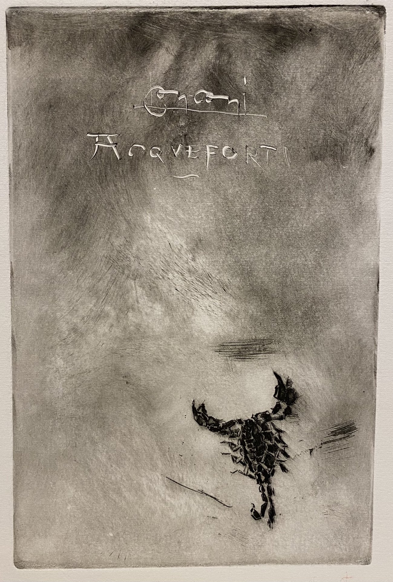 Nel foglio viene raffigurato uno scorpione in basso a destra; in alto al centro a monotipo la firma dell’artista e la scritta: Acqueforti. Questa lastra infatti è stata concepita come frontespizio di una raccolta di una cinquantina delle proprie acqueforti che Conconi intendeva pubblicare nel 1897 in un centinaio di esemplari, il progetto tuttavia non ebbe seguito. Del progetto resta documentazione sulle riviste dell’epoca: Luca Beltrami in The Studio del 15 luglio 1896, Guido Martinelli e W. Ritter su Emporium nel gennaio 1897 e nel luglio 1901 e Edmond de Goncourt in due lettere ad un amico in Italia del 1896 e 1897. Stato unico.