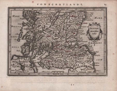 Mappa in miniatura tratta dall’Atlas minor, Das ist: Eine kurtze, jedoch gründliche Beschreibung der gantzen Weldt. ' Incisa da Abraham Goos o Pieter van den Keere, venne pubblicata per la prima volta da Johannes Janssonius nel 1628. L'Atlas Minor ' di Gerard Mercator fu concepito da Jodocus Hondius nel 1607 come edizione ridotta del popolare ' Atlas ' di Mercator in folio. L'Atlas Minor ' doveva essere più grande di un atlante tascabile, ma più piccolo di un atlante in folio, e aveva un prezzo adeguato a raggiungere una diversa clientela. Ci furono tre diverse edizioni dell'Atlas Minor ' pubblicate da autori diversi, ognuna con una nuova serie di mappe incise in rame. Jodocus Hondius pubblicò la prima edizione tra il 1607 e il 1621, e successivamente vendette le tavole in rame ad editori inglesi; tra il 1635-39 fu pubblicata un'edizione inglese dell’opera utilizzando molte delle tavole originali. Johannes Janssonius volle competere anche nel mercato dei “piccoli” atlanti e fece incidere nuove lastre di rame da Pieter van den Keere e Abraham Goos per la propria edizione dell’Atlas Minor, pubblicata in più lingue tra il 1628 e il 1651 La terza e ultima versione fu pubblicata da Jan Evertsz. Cloppenburch (o Cloppenburg) tra il 1630 e il 1734, con nuove mappe incise principalmente sempre da Pieter van den Keere. "Shortly after the publication of the big folio-atlases the need was apparantly felt for a smaller-sized atlas, one that would be handier, and, above all, cheaper, so that a larger public might have access to the use of maps. The publication of the ' Atlas Minor ' appeared to be a great success for Hondius; the first Latin edition was in great demand. The copperplates of the first atlases minor were most almost certainly engraved by Jodocus Hondius himself. After 1621, the copperplates of the ' Atlas Minor ' were sold to a London editor. Firstly, they appeared in ' Purchas his Pilgrinies, printed in 1625 by William Stansby for Henry Featherstone. Next they were used for the translation of the Mercator-atlas, printed in small folio under the title ' Historia mundi, or Mercators atlas, ' by Thomas Cotes for Michael Sparke and Samuel Cartwight in 1635". (cf. Koeman II Me 191). "As with the ' Theatrum ' of Abraham Ortelius, Jodocus Hondius planned a reduced size version of Gerard Mercator's folio atlas. Just one year after his first edition he published his Latin text ' Atlas Minor ' in collaboration with Jan Jansz. and Cormelis Claesz. The arrangement between these three is not understood clearly but Hondius is believed to have been the owner of the copperplates. Cartographically this is taken directly from the folio maps by Hondius in 1606 [.]. with the inevitable loss of detail due to the reduction” (cf. Burden, ' The Mapping of North America, 153). ' Johannes Janssonius (1588-1664) era figlio di un omonimo tipografo, editore e libraio di Arnhem. Nel 1612 sposò Elisabetta Hondius, figlia di Jodocus Hondius I, e nello stesso anno fondò una propria casa editrice ad Amsterdam. Alla morte di Jodocus I, nello stesso anno, iniziò ad aiutare la vedova di Hondius a continuare la pubblicazione dell'atlante di Mercatore e Hondius. Sia la vedova di Hondius, Colette, sia il figlio maggiore di Hondius, Jodocus II, morirono nel 1629; Janssonius unì quindi le forze con il figlio minore di Hondius, Henricus, per una revisione dell'Atlas Novus, a partire dal 1638. Acquaforte, in ottimo stato di conservazione. Dall’edizione tedesca dell’Atlas Minor, stampata ad Amsterdam nel 1648. Bibliografia Koeman IIIB, 352:33. A miniature map taken from ' Atlas minor, Das ist: Eine kurtze, jedoch gründliche Beschreibung der gantzen Weldt. ' Engraved by Abraham Goos or Pieter van den Keere, first issued by Johannes Janssonius in 1628. Mercator's ' Atlas Minor ' was conceived by Jodocus Hondius in 1607 as a reduced-sized edition of the popular folio-sized Mercator Atlas. The ' Atlas Minor ' was intended to be larger than a pocket atlas, yet smaller than the folio atlas, and were priced accordingly to reach a new market. There were three different editions of the ' Atlas Minor ' published by different authors, each with a new set of copperplates. Jodocus Hondius published the first edition from 1607-1621, and subsequently sold the copperplates to parties in England between 1621-1625, after which an English edition was published using many of the original plates in 1635-39. Johannes Jansson wanted to compete in the small atlas market as well, and had new copperplates engraved by Pieter van den Keere and Abraham Goos for his own edition published in multiple languages between 1628-51. The third and final edition was published by Jan Evertsz. Cloppenburch (or Cloppenburg) between 1630-1734 (some without text), with new maps engraved primarily by Pieter van den Keere. "Shortly after the publication of the big folio-atlases the need was apparantly felt for a smaller-sized atlas, one that would be handier, and, above all, cheaper, so that a larger public might have access to the use of maps. The publication of the ' Atlas Minor ' appeared to be a great success for Hondius; the first Latin edition was in great demand. The copperplates of the first atlases minor were most almost certainly engraved by Jodocus Hondius himself. After 1621, the copperplates of the ' Atlas Minor ' were sold to a London editor. Firstly, they appeared in ' Purchas his Pilgrinies, printed in 1625 by William Stansby for Henry Featherstone. Next they were used for the translation of the Mercator-atlas, printed in small folio under the title ' Historia mundi, or Mercators atlas, ' by Thomas Cotes for Michael Sparke and Samuel Cartwight in 1635". (cf. Koeman II Me 191). "As with the ' Theatrum ' of Abraham Ortelius, Jodocus Hondius planned a reduced size version of Gerard Mercator's folio atlas. Just one year after his first edition he published his Latin text ' Atlas Minor ' in collaboration with Jan Jansz. and Cormelis Claesz