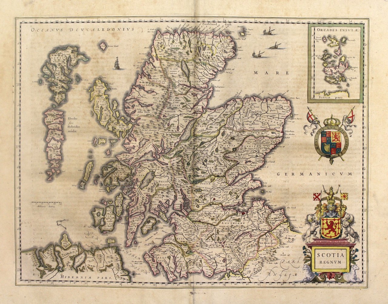 Incisione in rame, mm 385x505, testo latino al verso. Elegante e piacevole carta, arricchita da cartigli, navi e stemmi. Ottimo esemplare perfettamente conservata anche se lievemente ingiallita. W. Blaeu, astronomo allievo di Tycho Brahe, fondò un'officina per la costruzione di globi nel 1599; quasi immediatamente iniziò a pubblicare anche carte geografiche, giungendo nel 1630 alla creazione del primo atlante "Atlantis Appendix" e cinque anni dopo, della prima edizione in due tomi del "Atlas Novus". Dopo la sua morte nel 1638, a cura del figlio Johan si giunse nel 1662 alla pubblicazione del celebre "Atlas Maior" in 11 volumi. Nel 1672 un incendio distrusse l'officina e segnò la fine dell'attività. <BR>Copper engraving, mm 385x505, latin text on verso. Good condition even if slightly discolored. W. Blaeu, born in Alkmaar in 1571, studied astronomy by Tycho Brahe and founded a business in 1599 as a globe and instrument maker. He immediately expanded the business publishing maps and in 1630 the first atlas "Atlantis appendix" and five years later the "Atlas novus". After his death in 1638, his son Joan reached publication of the major work of the family, the "Atlas maior" in 11 volumes. In 1672 a great fire destroyed the Blaeu's printing house. <BR><BR>