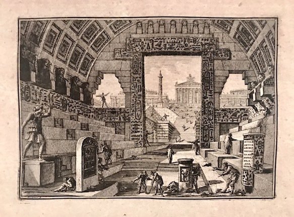 Incisione originale su rame (cm. 21,7x15,1 più ampi margini bianchi) tratta dalla rara opera ‘Opere varie di Architettura, Prospettive, Grotteschi, Antichità sul gusto degli antichi Romani.’. Magnifica prova impressa su carta vergellata. Esemplare in eccellente stato di conservazione. Focillon, n. 128; Wilton-Ely, n. 49; Ficacci, n. 408. Questa incisione, alla pari di ogni altra frutto del lavoro giovanile presente nelle ‘Opere varie’, ben evidenzia in maniera particolare le doti di inventiva e di fantasia che avrebbero caratterizzato tutta la produzione artistica di Piranesi.