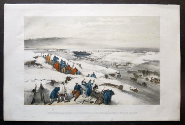 Tratta da “Seat of War in the East”. Paul & Dominic Colnaghi & C.°, London 1855 – 1856. Tonolitografia in recente ma bella coloritura a mano, cm 37 x 55,5 circa (il foglio). Disponiamo di numerose tavole appartenenti alla prima o seconda serie. Le tavole sono tutte delineate da William Simpson e litografate da vari autori, tra cui E. Walker, J. Needham, T. Picken e altri. Piccolissimi strappetti al margine bianco inferiore e destro, un minimo e lieve foxing, bella coloritura e in buono stato di conservazione.