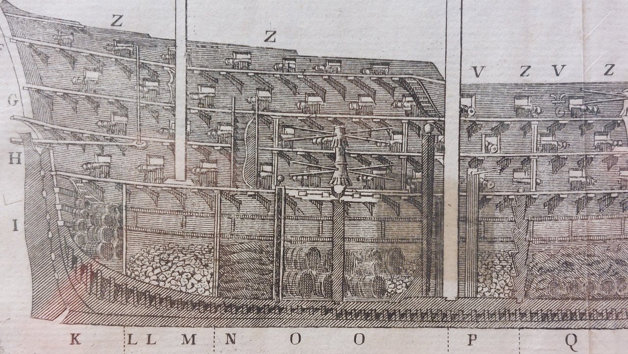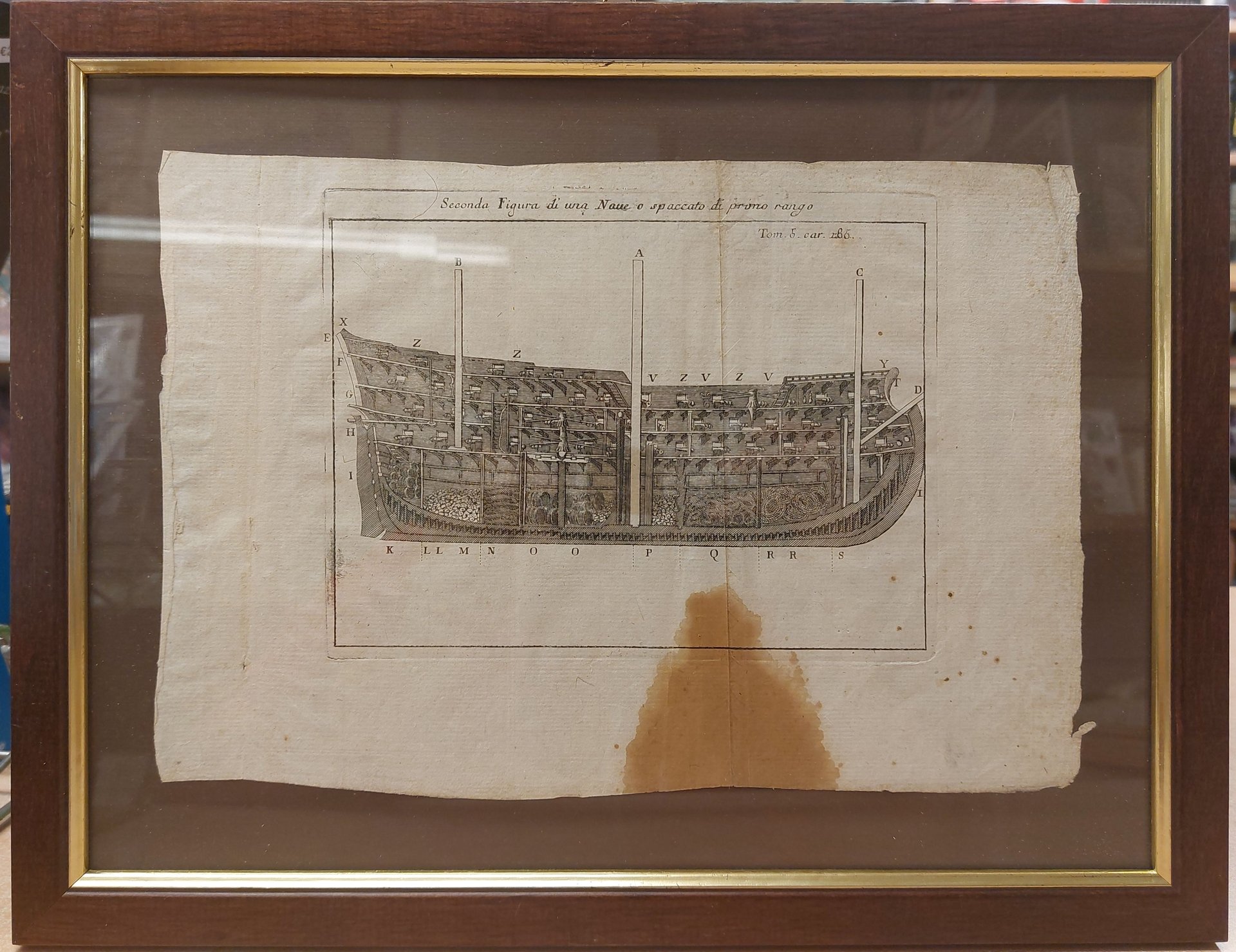 Incisione originale su rame (cm. 26,5x18,5, incorniaciato cm.34x26,3). Raffigura la seconda figura di una nave o spaccato di primo rango (Tom. 5, car. 185). Proveniente dal trattato in nove volumi "Le Spectacle de la Nature" di Noël Antoine Pluche (1688-1761, scrittore e naturalista francese). Considerato un grande trattato di divulgazione scientifica che fù. tradotto in tutta Europa e influenzò molti a diventare naturalisti. Si riscontra una macchia di umidità sul lato basso.