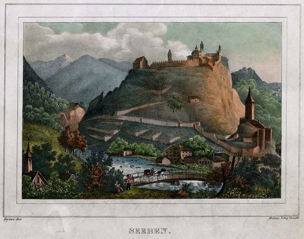 Litografia a colori di dimensioni 158x230 mm. Condizioni : USATO - Stato : Buono, ordinari segni d'uso e del tempo. Altre note : Veduta del monastero di Sabiona (Kloster Säben) in Alto Adige. Il monastero, edificato nel XVII secolo, sorveglia il borgo di Chiusa (Klausen) in Val d'Isarco. Sotto la rupe il fiume scorre verso l'osservatore, nel primissimo piano una scena familiare. La stampa si trova in "I castelli del Tirolo colla storia delle relative antiche-potenti famiglie" di Agostino Perini.