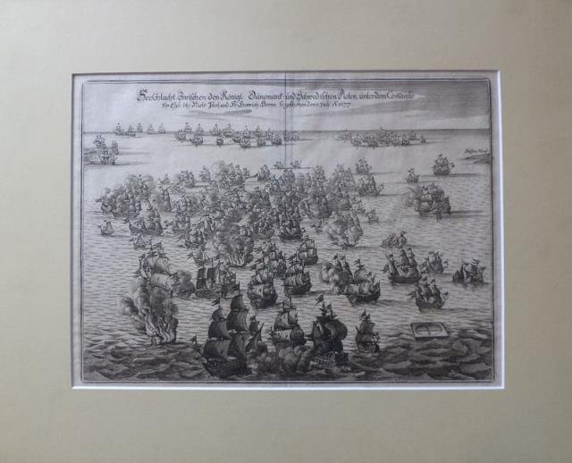 Germania, 1680 circa. Incisione in rame, b/n, cm 27,3 x 36,8 (alla lastra). Magnificamente incisa dal Merian, bella scena di battaglia navale, animata da flotte col fuoco aperto, lungo titolo in gotico in cui si riporta la data del 1677, relativa alla battaglia tra marittima fra Danesi e Svedesi. Ottima impressione, molto buono lo stato di conservazione.