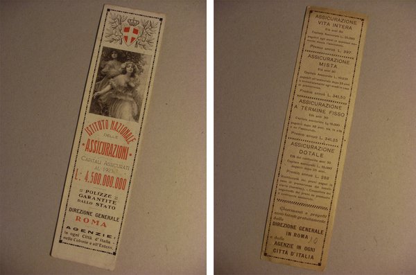 Segnalibro pubblicitario "Istituto Nazionale delle Assicurazioni. Direzione Generale ROMA" Premi assicurativi. 1923