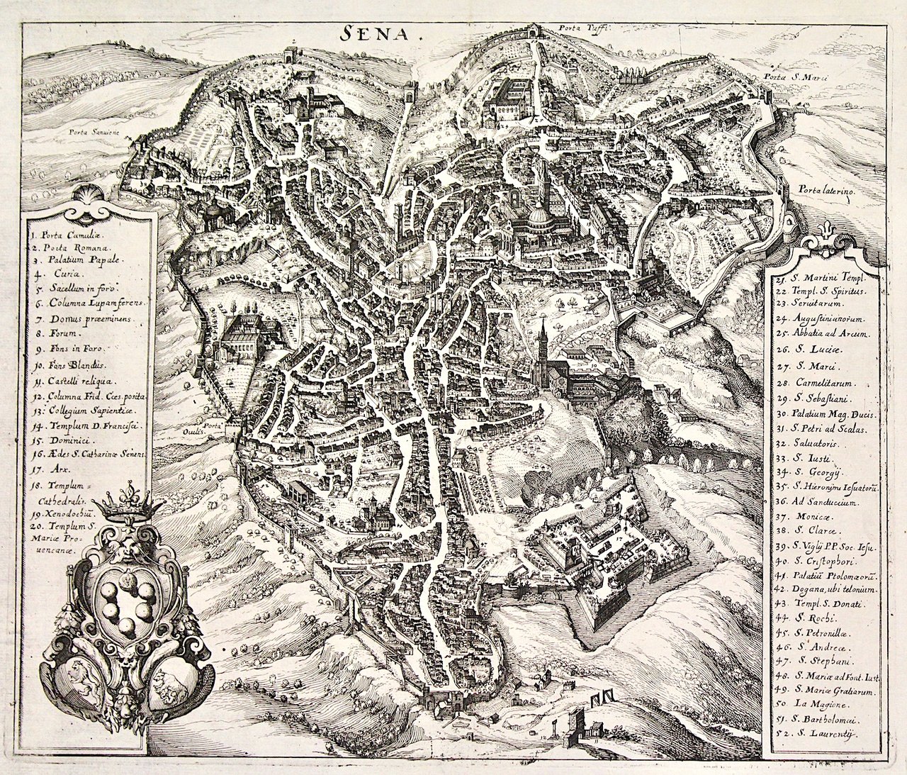 Incisione in rame, 245x290. Bella veduta prospettica generale della città; ai lati una legenda con 52 rimandi. Ottimo esemplare marginoso. Qualche restauro al margine inferiore.