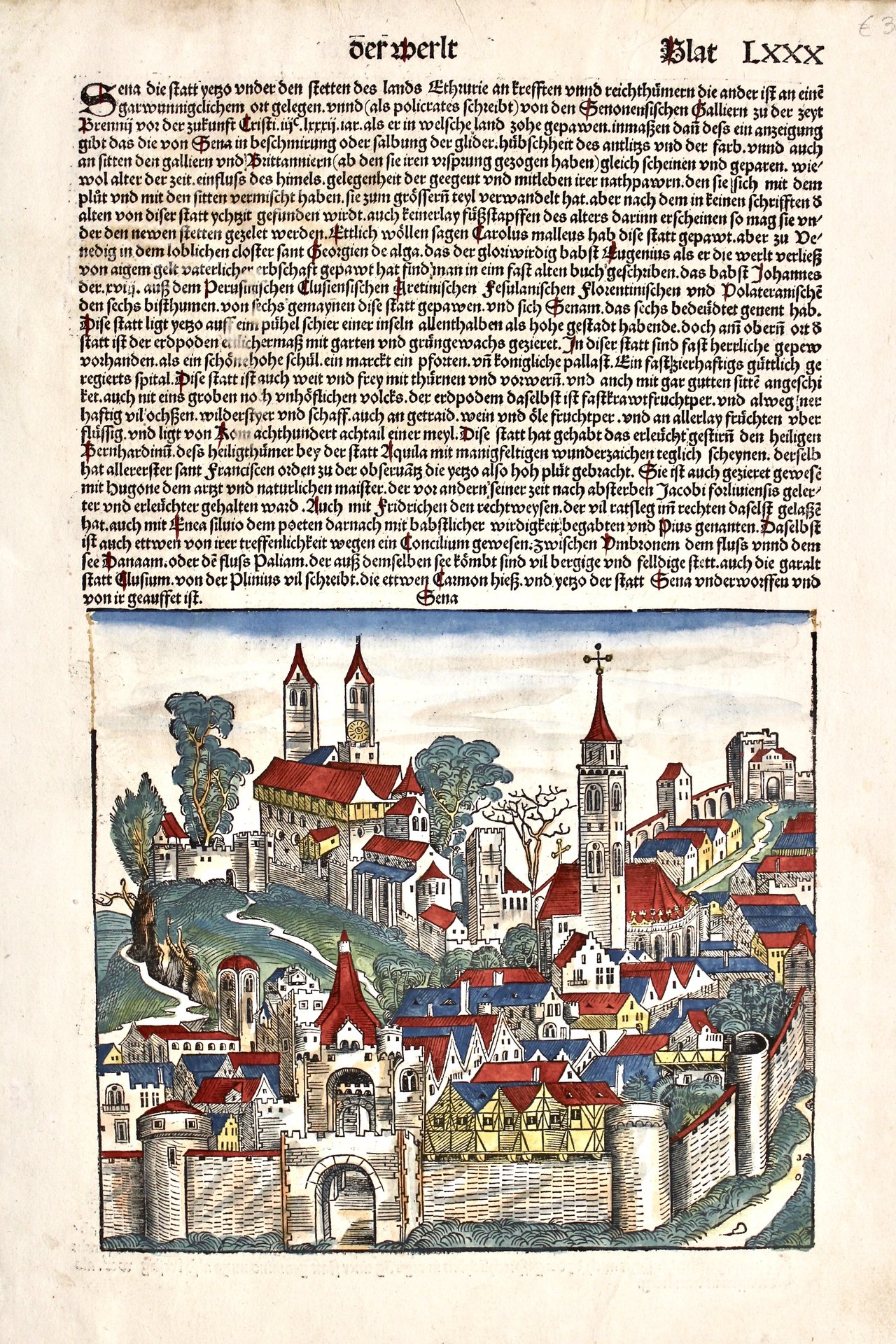 Silografia, mm 190x225), dipinta a mano solo al recto del foglio. Ottimo stato di conservazione <BR>Veduta fantastica della città con relativa descrizione con testo latino. Il "Liber Chronicarum" comunemente chiamato "Cronaca di Norimberga" dalla città di stampa, fu la prima opera contenente anche raffigurazioni reali delle città del mondo ed ebbe un enorme successo, tale da essere considerata una pietra miliare nello sviluppo della conoscenza geografica. <BR>