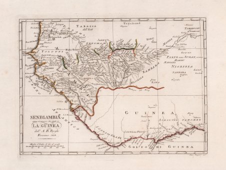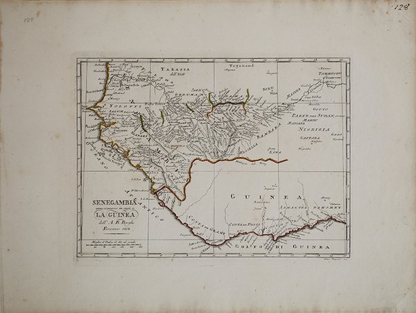 Carta geografica tratta dal raro "Atlante Geografico" dell'abate Bartolomeo Borghi (1750-1821), cartografo, incisore ed editore che tra l'altro pubblicò l'atlante del Pazzini Carli in Siena. Incisione in rame, coloritura coeva dei contorni, in ottimo stato di conservazione. A rare map from "Atlante Geografico" of priest Bartolomeo Borghi. Copperplate with original outline colour, in very good condition. Bartolomeo Borghi(1750-1821) was an italian cartographer, engraver and publisher (editor of Atlante Geografico by Pazzini Carli, Siena 1788/1800). Cfr.