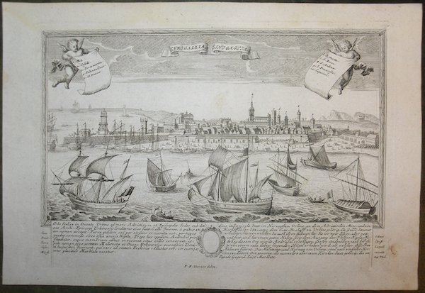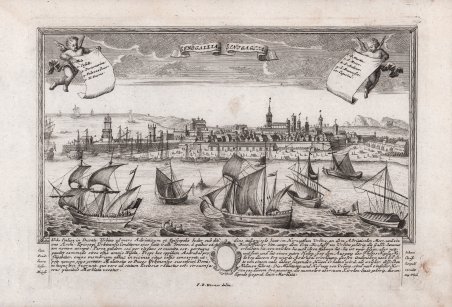Bella e rara veduta panoramica della città delineata sulla scia della più grandi vedute disegnate da Fredrich Bernhard Werner e pubblicata ad Augsburg dagli eredi dell’editore Jeremias Wolff (1663-1724), Georg Balthasar Probst (1673-1750) – suo genero – e il suo successore, il figlio Johann Friedrich (1719-1781). Werner, nato a Reichenau, fu disegnatore, incisore, ingegnere e scenografo; durante la sua intensa vita viaggiò a lungo in vari stati europei prima in qualità di soldato poi come semplice viaggiatore, realizzando numerosi disegni dei luoghi visitati. Dopo aver trascorso un periodo di studio ad Augsburg collaborando con l’incisore K. Remshard, nel 1730 egli intraprese un viaggio in Italia, visitando molte città della penisola, per poi diventare ingegnere e scenografo del re di Prussia. La sua vasta produzione comprende una molteplicità di lavori dedicati a luoghi e città di vari paesi europei – Polonia, Olanda, Francia, Italia – soffermandosi in particolare sulla sua patria, alla quale sono dedicate le immagini della “Scenografia urbium Silesiae”, edita dagli eredi di Johann Baptist Homann a Norimberga. Werner può essere considerato uno dei più prolifici disegnatori della sua generazione, uno degli ultimi grandi personaggi che nel corso del Settecento si dedicano alla realizzazione del ritratto di città rappresentando la struttura urbana nella sua interezza, nel solco di una tradizione ormai secolare; nel corso del secolo le logiche che si affermeranno saranno invece da un lato quelle che frantumeranno la città in più immagini, dall’altro quelle che porteranno alla definitiva affermazione della topografia scientifica. Le immagini del Werner costituiscono un modello per la realizzazione di alcune altre vedute edite in Europa. Tra queste vanno ricordate quella dell’editore viennese Christofer Haffner (1668-1754), attivo probabilmente tra il 1720 e il 1750, e quelle di Johann Christian Leopold (1699-1755). Il Leopold, era un modesto incisore ed editore di Augsburg; la sua serie di vedute di città, da cui questa incisione è tratta, venne pubblicata con pochissima tiratura, rendendo quindi le opere particolarmente rare. Incisione in rame, in ottimo stato di conservazione. Beautiful and rare panoramic view of the city sketched in the wake of the greatest views drawn by Fredrich Bernhard Werner and published in Augsburg by the heirs of publisher Jeremias Wolff (1663-1724), Georg Balthasar Probst (1673-1750) - his son-in-law- and his successor, his son Johann Friedrich (1719-1781). Werner, born in Reichenau, was a draughtsman, engraver, engineer and stage designer; during his busy life he traveled extensively in various European states first as a soldier then as a simple traveler, producing numerous drawings of the places he visited. After spending a period of study in Augsburg working with engraver K. Remshard, he undertook a trip to Italy in 1730, visiting many cities on the peninsula, later becoming engineer and set designer to the King of Prussia. His vast output includes a multiplicity of works devoted to places and cities in various European countries - Poland, Holland, France, Italy - dwelling particularly on his homeland, to which the images of the "Scenografia urbium Silesiae", published by the heirs of Johann Baptist Homann in Nuremberg, are dedicated. Werner can be considered one of the most prolific draughtsmen of his generation, one of the last great figures during the eighteenth century to devote himself to the creation of the city portrait by depicting the urban structure in its entirety, in the wake of a tradition that was now centuries old; in the course of the century, the logics that would assert themselves would instead be, on the one hand, those that would break the city into several images, and on the other, those that would lead to the definitive establishment of scientific topography. Werner's images provide a model for the creation of a number of other views published in Europe. These include those of the Viennese publisher Christofer Haffner (1668-1754), active probably between 1720 and 1750, and those of Johann Christian Leopold (1699-1755). Leopold, was a modest Augsburg engraver and publisher; his series of city views, from which this engraving is taken, was published with very few print runs, thus making the works particularly rare. Copperplate engraving, in very good condition. Cfr.