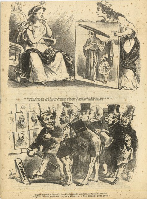 - Codesta alleata mia, sarà la fedele immagine colla quale ti rappresenterà l'Europa, qualora invece di salvare Nardoni dal Temporale, ti ostinassi a salvare il temporale a messer Nardoni!- Signori Senatori e Deputati.nuovi!.In coteste caricature del Fischietto ravvisate le fotografie dei vostri predecessori che più si distinsero!.A buon intenditor poche parole!La stampa è stata piegata per la spedizione e porta al retro, con inchiostro rosso, un timbro rotondo di 1 centesimo,testo al verso