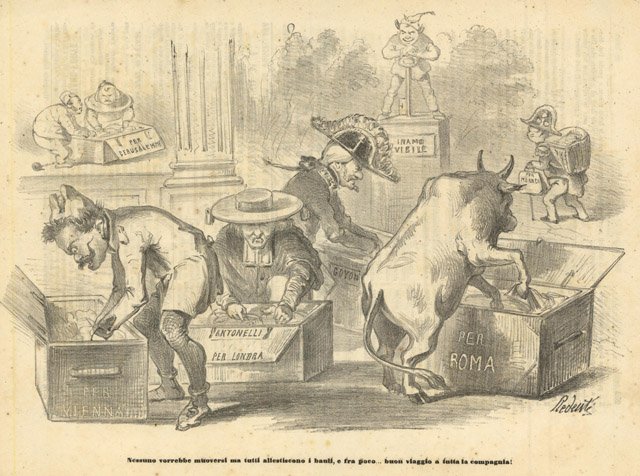 Nessuno vorrebbe muoversi ma tutti allestiscono i bauli, e fra poco.buon viaggio a tutta la compagnia!La stampa è stata piegata per la spedizione e porta al retro, con inchiostro rosso, un timbro rotondo di 1 centesimo,testo al verso