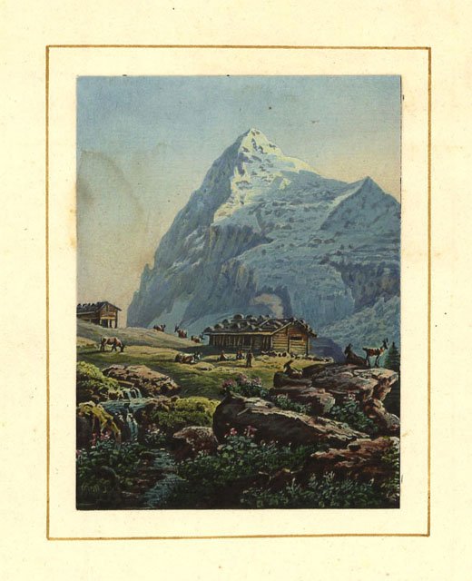 Piccola veduta del Monte Eiger animata da alcuni personaggi ed animali al pascolo. La stampa con margini ridotti è applicata su un vecchio supporto cartaceo