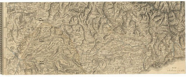 Particolare della carta disegnata da Bacler D'Albe "Carte Générale Du thèatre de la Guerre en Italie et dans Les Alpes Dépuis le passage du Var le 22 7bre 1792 V.S. jusqu'à l'entée des francais à Rome le 22 pluviose an 6.me Rép.ain .". La carta rappresenta parte del territorio delle Alpi Marittime, Valle del Varo, Nizza, Monaco e Ventimiglia. Evidenziati a colori i vari schieramenti, gora