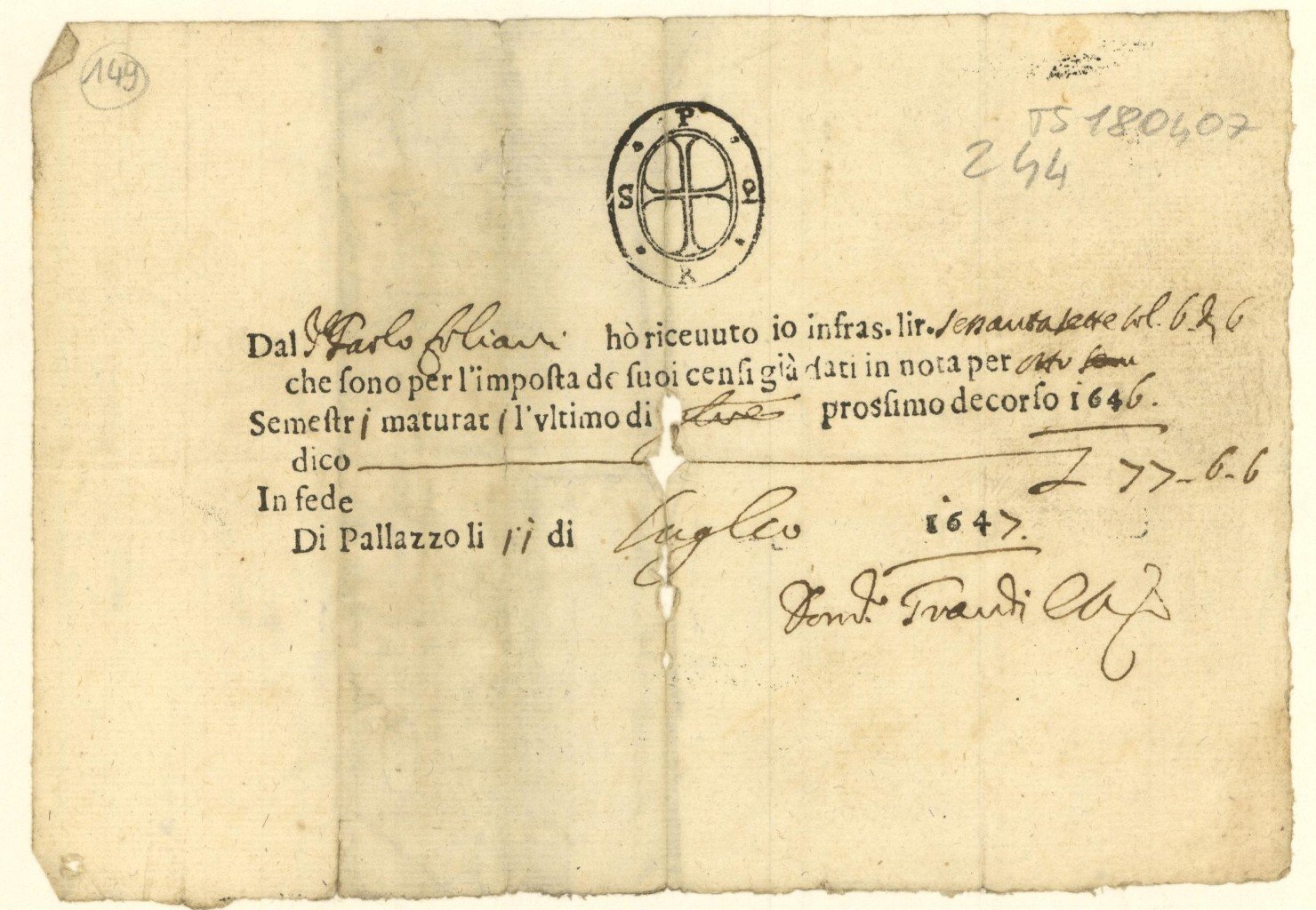 Documento, antico ed originale proveniente da importante collezione reggiana, con ricevuta di pagamento d’imposta del luglio 1647