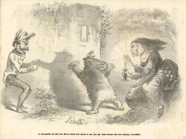 Armonia mi dir che Orsa russa dar mano a mi, ma mi non toccar che sua ombra, tartaifel!.La stampa è stata piegata per la spedizione e porta al retro, con inchiostro rosso, un timbro rotondo di 1 centesimo,testo al verso