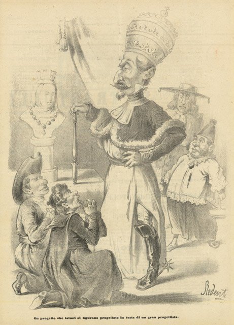 Il progetto che taluni si figurano progettato in testa di u gran progettista.La stampa è stata piegata per la spedizione e porta al retro, con inchiostro rosso, un timbro rotondo di 1 centesimo,testo al verso