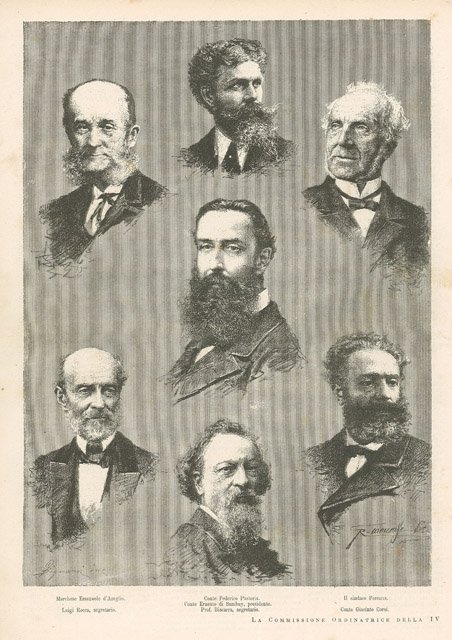 Ritratti dei membri della commissione della IV Esposizione Nazionale di Belle Arti a Torino: Emanuele d’Azeglio, Federico Pastoris, Luigi Ferraris, Ernesto di Sambuy (presidente), Luigi Rocca, Giacinto Corsi e Carlo Felice Biscarra. Testo al verso