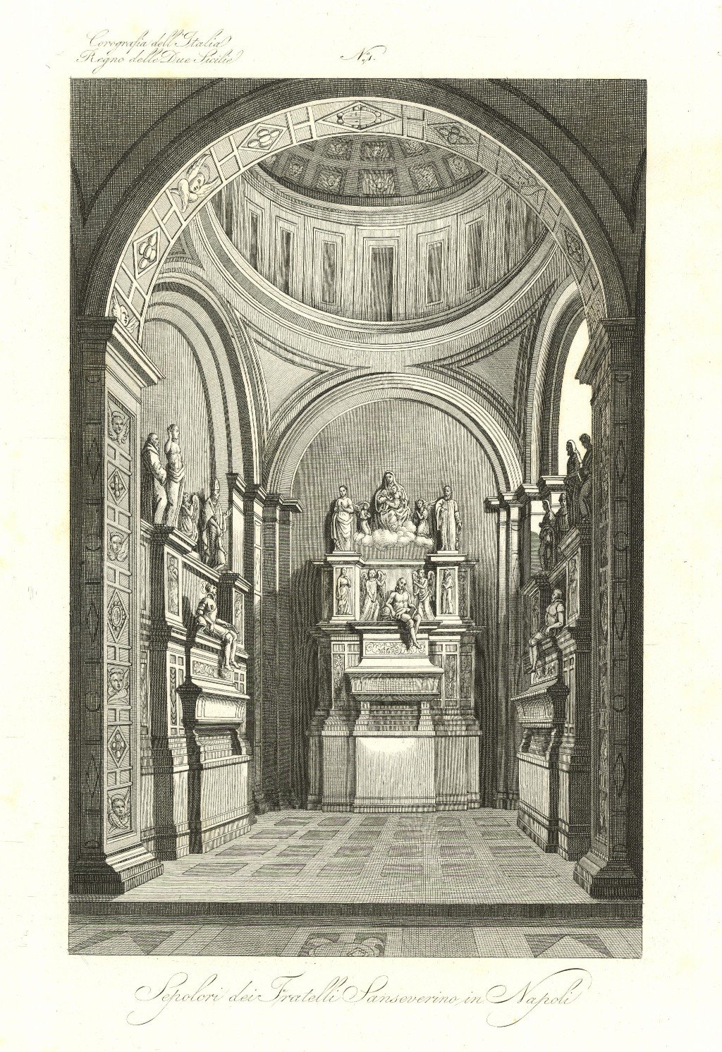 Veduta interna della Cappella con i Sepolcri. Stampa antica originale