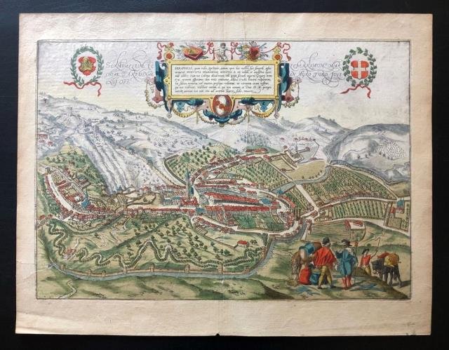 Dal “Civitates Orbis Terrarum”, Colonia, 1588 circa. Incisione in rame, colore d’epoca, cm 33,7 x 48,8 (alla lastra) più margini; ricco cartiglio centrale riccamente ornato e con didascalia descrittiva, titolo in alto, ai lati del cartiglio e tra due stemmi laterali; testo latino al verso. George Braun (1541 - 1622), chierico di Colonia, è stato il principale curatore del “Civitates Orbis Terrarum”, per la prima volta pubblicato a Colonia nel 1572, poi edito ad Anversa e a Colonia fino al 1618, anno in cui apparve il sesto e ultimo volume. Queste le principali edizioni: 1572, vol. I; 1575, vol. II; 1581 vol. III; 1588 ca. vol. IV; 1598 ca. vol. V; 1618 vol. VI. Questi volumi vennero pubblicati originariamente in latino, e poi ristampati in tedesco e in francese. Il volume VI comprendeva un’edizione di piante supplementari. Dopo il 1618 le lastre divennero di proprietà di Abraham Hogenberg, il quale si incaricò delle successive riedizioni. Alla sua morte, le lastre vennero acquistate da Jan Jansson il quale, usandole come base, pubblicò un’edizione in otto volumi, riedita a sua volta negli anni successivi. Veduta della città con resa prospettica. Per Serravalle transitava una parte dei traffici commerciali che intercorrevano fra l’Europa centrale e Venezia e qui avevano sede celebri fonderie specializzate nella costruzione delle campane e fabbriche d’armi, come ricorda anche Georg Braun nel commento alla pianta di Serravalle dello stesso “Civitates”: “celebrem armorum obellicorum officinam, pannorumque, vim ac frumenti negotiatione inclytum emporium. perpetuos habet montes, per quos Germani Serauallum, emporium illis gratissimum, frequentant.”. Buon esemplare a pieni margini e in tenue ma bella coloritura.