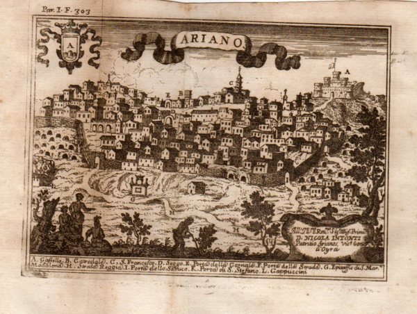 Incisione al'acquaforte, f. 14x18 cm. ca. In: PACICHELLI, Giovanni Battista. Il Regno di Napoli in prospettiva. Napoli, Stamperia Luigi Mutio