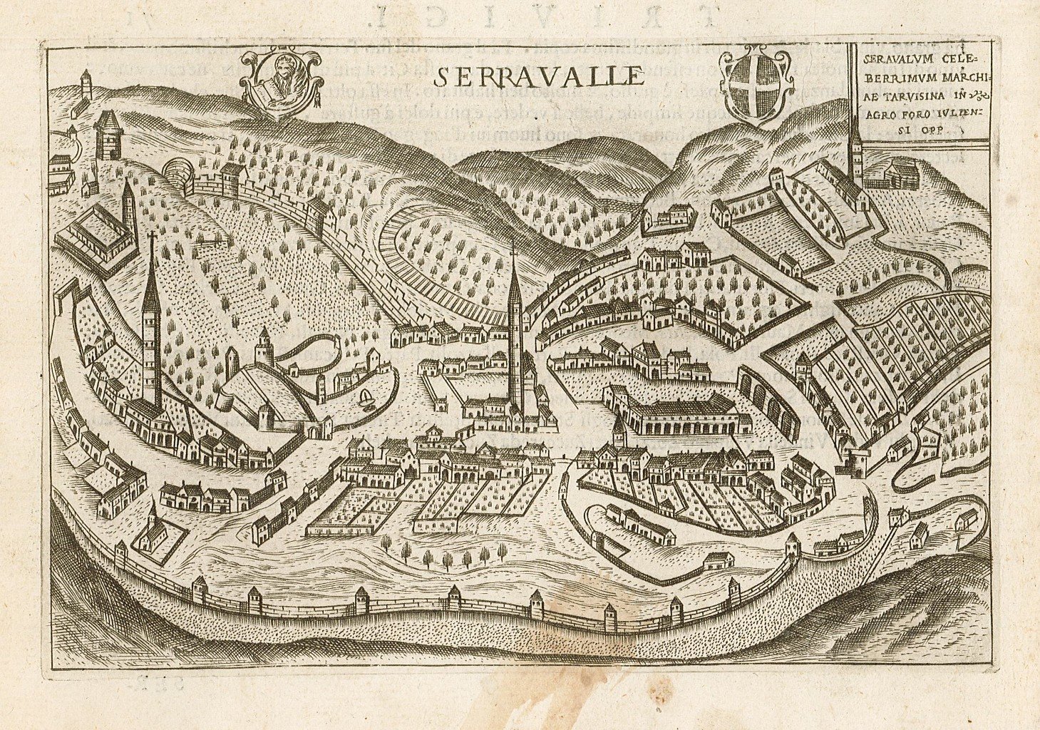 Stampa antica ed originale con veduta prospettica della città di Serravalle. In alto al centro, nel corpus dell'incisione, è riportato il titolo ai cui lati sono raffigurati lo scudo della città e quello del Dominio Vento con il leone marciano. Ottima impressione. Autore: Bertelli Francesco edit. Luogo: Serravalle. Anno: 1629. Tecnica: incisione in rame. Dimensioni: 116x177 mm
