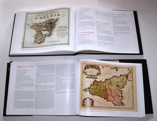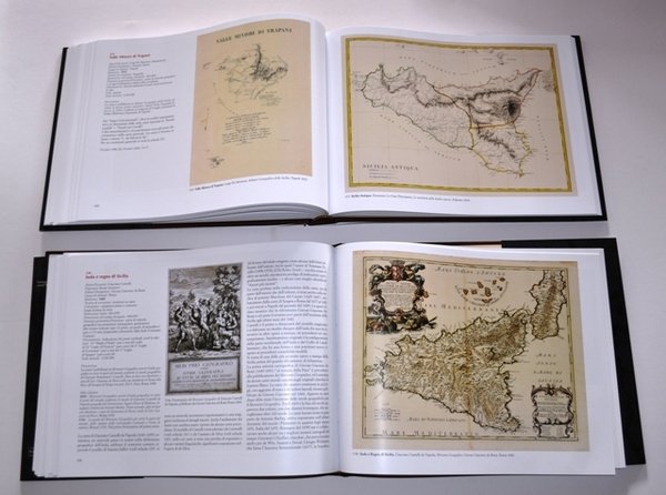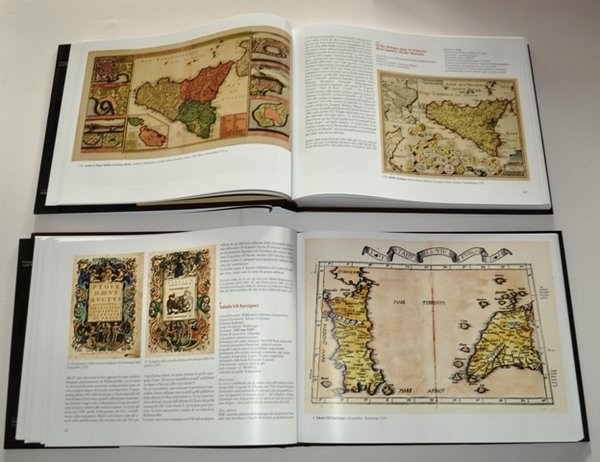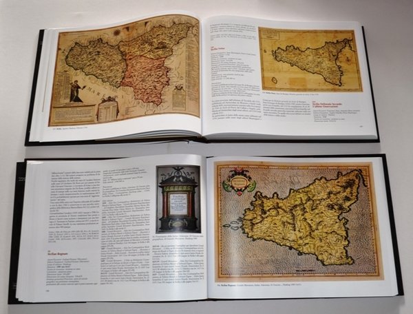 Nuovo catalogo ragionato delle carte geografiche a stampa della Sicilia redatto in 2 vol in 4° oblungo di 735 pag. Stampato a colori e riccamente illustrato con 52 immagini nei testi introduttivi, 11 immagini nel '400, 130 immagini nel '500, 167 immagini nel '600, 201 immagini nel '700 e 185 immagini nell'800, per un totale di 746 immagini di cui oltre 600 a colori.Questa pubblicazione vuole mettere ordine nell’enorme produzione cartografica a stampa sulla Sicilia, mai integralmente schedata, e suggerire nuovi e differenti approcci alla ricerca storica descrivendo minutamente oltre 400 mappe dell’isola prodotte tra il 1477, data della prima carta a stampa della Sicilia mai prima d’ora riprodotta in un moderno repertorio, e il 1861, data dell’Unità d’Italia. Sette saggi introduttivi, scritti da esperti studiosi trattano dalla tradizione geografica di Tolomeo, dell’incisione tra Venezia e Roma nel ’500, degli Isolari e della loro fortuna editoriale, dei significati simbolici degli apparati figurativi e altro ancora e introdurranno il ‘viaggiatore’ alla lettura di questi affascinanti documenti grafici.Le vicende della Sicilia, isola di antichissima umanizzazione con una storia plurisecolare, sono collegate ai principali avvenimenti europei; per tale motivo una lettura a più livelli di indagine delle sue raffigurazioni cartografiche consente di leggere in filigrana l’intera storia della cultura occidentale dalle innovazioni scientifiche e tecnologiche a quelle artistiche, incisorie e tipografiche, dagli sviluppi dell’astronomia e della geografia agli avvenimenti economici, politici e militari.Le carte migliori sono spesso un palinsesto che talvolta solo attraverso l’uso di strumenti propri della filologia si riesce a leggere in tutti i livelli informativi. Quasi tutte le carte sono un coacervo di fonti, letterarie, grafiche, descrittive, orali, miti e osservazioni dirette, tutte miscelate secondo la propensione o la sensibilità del cartografo. Il prezzo di euro 250 è scontato ad euro 220