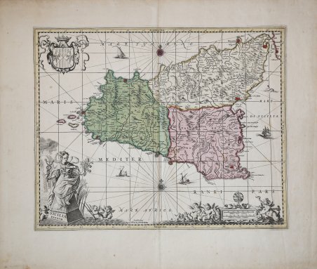 Rara edizione di Valck e Schenk della celebre carta della Sicilia di Janssonius. La carta - pubblicata per la prima volta nel Novus Atlas del 1645 - si basa sulla mappa di Mercatore del 1589; vi sono solo alcune significative aggiunte negli apparati decorativi con l’inserimento di una figura femminile, ripresa dall'analoga carta di Blaeu del 1635, lo stemma della corona di Sicilia e una serie di tritoni e divinità marine poste a contorno della scala grafica. Il rame passò nelle mani degli stampatori Valck e Schenk che la rimisero in commercio con la sola aggiunta del reticolo geografico e la variazione dei dati editoriali. Le coordinate sono diverse da quelle utilizzate per la Sicilia di Mercatore - per cui Messina passa da 37° 55' a 34° 55' - e sembrano riferirsi piuttosto alle isole del Capo Verde. “Si tratta dello stesso rame stampato da Joannes Janssonius nel 1645, con la sola aggiunta del reticolo geografico e la modifica dell'imprint editoriale, che diventa "apud G. Valk et P. Schenk". Il reticolo grafico ha una scansione di mezzo grado. La datazione, così come la provenienza di tale carta, ossia l'inserimento di tale carta in un atlante, è molto problematica. Petrus Schenk I (1660-1718 ca) fu incisore ed editore tedesco, trasferitosi giovanissimo ad Amsterdam dove divenne allievo di Gerad Valk (1656-1726) e del quale sposò la sorella Agatha nel 1687. L'associazione tra i due risale già ai primi anni 80 del Seicento; intorno al 1690 si trovarono ad acquistare gran parte dei rami di Janssonius che furono da loro editi con piccoli ritocchi e modifiche. In una lista di carte di Janssonius possedute e commercializzate da "Petrus Schenk & Gerardus Valk", conservata nella Herzog August Bibliotheck di ' Wolfenbüttel, purtroppo non datata, al numero 399 è segnalata l'isola di Sicilia. È molto probabile che il rame sia stato stampato ancora e commercializzato anche nel corso del Settecento a opera degli eredi Leonard Valk (1675-ante 1755) e Petrus Schenk II (1698-1775)” (cfr. Valerio, p. 318). Bibliografia V. Valerio, Sicilia 1477-1861, La collezione Spagnolo-Patermo in quattro secoli di cartografia, n. 143; KOEMAN 1967-1985: III, 107-114 (Schenk), 136-140 (Valck). Rare Valck and Schenk edition of Janssonius' famous map of Sicily. The map - first published in the Novus Atlas of 1645 - is based on Mercator's map of 1589; there are only a few significant additions in the decorative apparatuses with the inclusion of a female figure, taken from Blaeu's similar map of 1635, the coat of arms of the crown of Sicily, and a series of tritons and sea gods placed around the graphic scale. The copperplate passed into the hands of printers Valck and Schenk, who reissued it with only the addition of the geographic grid and the change in editorial data. The coordinates are different from those used for Mercator's Sicily-for which Messina changes from 37° 55' to 34° 55'-and seem to refer rather to the Cape Verde Islands. “This is the same copperplate printed by Joannes Janssonius in 1645, with only the addition of the geographic grid and the change of the editorial imprint, which becomes "apud G. Valk et P. Schenk." The graphic reticle has a half-degree scan. The dating, as well as the provenance of such a chart, i.e. the inclusion of such a chart in an atlas, is very problematic. Petrus Schenk I (c. 1660-1718) was a German engraver and publisher who moved to Amsterdam at a very young age where he became a pupil of Gerad Valk (1656-1726) and whose sister Agatha he married in 1687. The association between the two dates back as early as the early 1680s; around 1690 they happened to acquire most of Janssonius's copperplates, which were edited by them with minor retouches and modifications. In a list of Janssonius maps owned and traded by "Petrus Schenk & Gerardus Valk" preserved in the Herzog August Bibliotheck in Wolfenbüttel, unfortunately undated, the island of Sicily is noted at number 399. It is very likely that the copperplate was also printed again and marketed during the eighteenth century by the heirs Leonard Valk (1675-ante 1755) and Petrus Schenk II (1698-1775)” (cfr. Valerio, p. 318). Bibliografia V. Valerio, Sicilia 1477-1861, La collezione Spagnolo-Patermo in quattro secoli di cartografia, n. 143; KOEMAN 1967-1985: III, 107-114 (Schenk), 136-140 (Valck). ' Cfr.