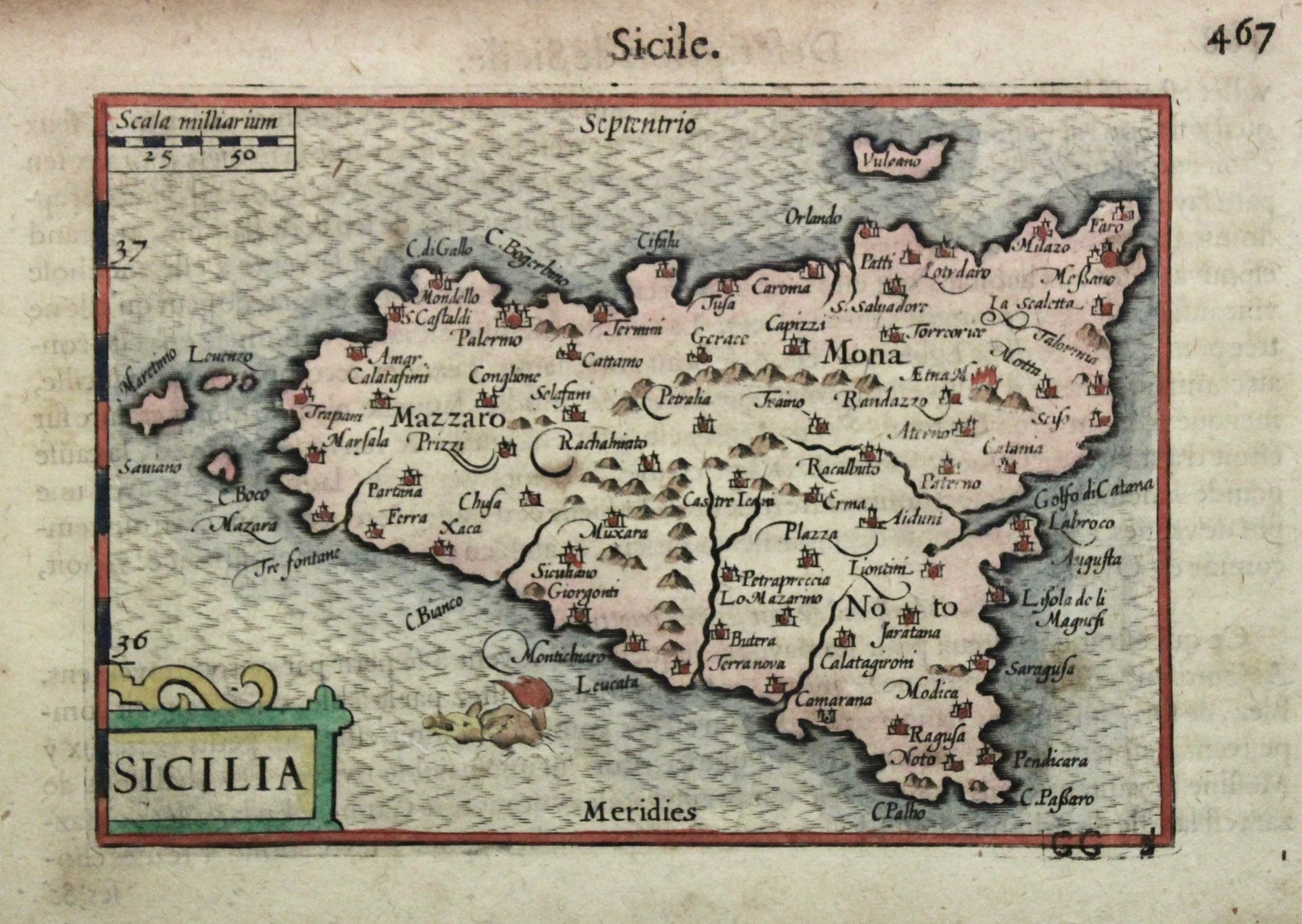 Incisione in rame, dipinta a mano, mm 87x126 su foglio mm 123x180, tratta da una edizione con testo francese di "Tabulae geographicae contractae". Buon esemplare con ususale carta un po' ingiallita, qualche lieve macchie e piccolo alone