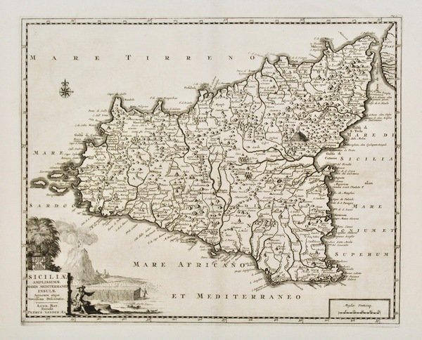 Incisione in rame, mm 305x380. Bella carta geografica dell'isola, con ricco cartiglio in basso a sinistra. Ottimo esemplare con piega centrale editoriale, lievemente ingiallita. Estratto da: GRAEVIUS JOANNES GEORGIUS. Thesaurus antiquitatum et historiarum Italiae.