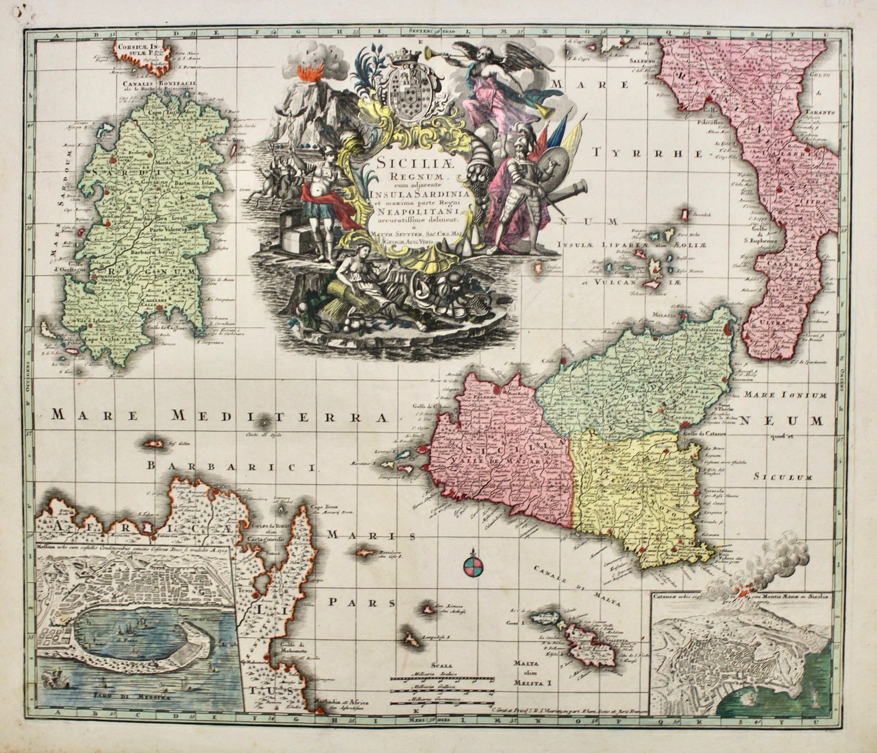 Incisione in rame, coloritura originale d'epoca, ricco cartiglio colorato d'epoca, seppur parzialmente, in alto al centro. Mm 488x578. In basso riporta le piante, in parte colorate d'epoca, di Messina a sin. e Catania a d. Seutter, dopo un apprendistato presso Homann a Norimberga, trasferitosi ad Augsburg verso il 1720, aprì la propria attività superando il maestro sotto il profilo della bellezza: le sue carte hanno sempre colori brillanti e cartigli elaborati. Esemplare in ottimo stato di conservazione.