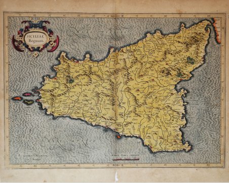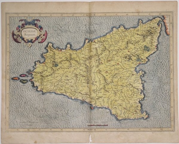 La carta viene preparata da ' Gerard Mercator per il suo ' Italia, Sclavoniae et Graeciae tabula geographicae ' (Duisburg, 1589) che comprende un frontespizio allegorico e 22 carte geografiche della penisola, dei Balcani e della Grecia. Successivamente le carte sono ristampate nell’Atlantis Pars Altera ' (1595) ' pubblicato postumo alla morte del Mercatore, dallo stampatore di Duisburg ' Albert Buys, sotto la supervisione del figlio Rumold Mercator. Composto da sei parti – pubblicate separatamente tra il 1589 e il 1594 – comprende 107 mappe, tutte tranne la carta del mondo di Rumold, firmate da Gerard Mercator. Le lastre vennero poi acquistate da Jodocus Hondius, che tra il 1606 e il 1630 le utilizzò per il suo ' Atlas Sive Cosmographicae Meditationes de Fabrica Mundi, integrandole ed aggiornandole con proprie “nuove” carte. Delle mappe di Mercator sono note anche ristampe curate da Johannes Janssonius. Le edizioni Hondius e Janssonius ebbero un grande successo commerciale e furono stampate in più lingue, con il testo al verso della carta in latino, francese, tedesco e olandese. La carta è incisa con i connotati tipici dell'opera mercatoriana. Le montagne sono allineate in un concetto di area montuosa, non per indicare vere catene o valli, ed hanno una struttura con qualche differenza nella dimensione, ma simile per quanto riguarda la forma, con pendici verticali e cime piatte. Le città sono mostrate attraverso castelli più o meno grandi caratterizzati da tetti slanciati ed aguzzi, simili a cappelli di mago. ' ESEMPLARE DALLA PRIMA EDIZIONE DI ' ATLANTIS PARS ALTERA. ' “Si tratta della prima carta della Sicilia moderna realizzata da Gerard Kremer (1512-1594) detto Mercatore, ritenuto dagli studiosi il più famoso geografo dopo Tolomeo, la cui bibliografia è tra le più abbondanti nel campo storico cartografico. Basti considerare che la sua prima biografia comparve già nel 1595, nel testo del suo Atlas, un anno dopo la morte. Nacque nel 1512 a Rupelmonde ma seguì corsi universitari a Leuven dove si diplomò nel 1532. Dal 1535 seguì corsi di matematica sotto la guida di Gemma Frisio. Si affermò subito come costruttore di strumenti scientifici e di globi, nonché rilevatore e cartografo. Nel 1537 fu pubblicata la sua prima mappa della Palestina, mentre i suoi primi globi terrestre e celeste sono rispettivamente del 1541 e del 1551. Nel 1552 si trasferì a Duisburg, per evitare le persecuzioni religiose (era stato in prigione per quattro mesi a Rupelmonde con l'accusa di eresia), e divenne in breve cosmografo al servizio del duca Guglielmo. In questo periodo videro la luce le prime importanti opere cartografiche: una carta murale dell'Europa (1554), una della Lo- rena (1563) e delle isole britanniche (1564) per arrivare, nel 1569, al suo planisfero in proiezione a latitudine crescente (nota come proiezione di Mercatore) che lo consacrerà alla futura memoria. A tale periodo risale anche l'intenzione di realizzare una descrizione completa del- l'Universo: stelle, terra, mare unitamente a una storia del mondo. Il risultato fu il suo primo atlante intitolato Atlas, sive cosmographicae meditationes de fabbrica mundi et fabbricati figura, stampato con tale titolo solo nel 1595, un anno dopo la sua morte, dal figlio Rumold. Le prime carte di quello che diverrà l'Atlas mercatoriano furono stampate sotto il titolo di Galliae Tabulae geographicae, The seventeene Provinces of the Lowe countries, entrambe nel 1585, e Italiae, Sclavoniae, et Graeciae tabulae geographicae, nel 1589. In questo ultimo volume, compare per la prima volta la "Siciliae Regnum" disegnata da Mercatore. A differenza delle mappe di Ortelius, che utilizzava materiale di altri autori, quelle di Mercatore sono originali e provengono da sue personali osservazioni o elaborazioni. Il rame fu utilizzato in tutte le successive edizioni del- l'atlante di Mercatore curate da Hondius e Janssonius fino al 1635; a partire dal 1636 il rame risulta modificato . The map is prepared by Gerard Mercator for his ' Italia, Sclavoniae et Graeciae tabula geographicae ' (Duisburg, 1589), which includes an allegorical frontispiece and 22 maps of Italy, the Balkans and Greece. Later, the maps are reprinted in the ' Atlantis Pars Altera ' (1595) published posthumously after the death of Mercator, by the Duisburg printer Albert Buys, under the supervision of his son Rumold Mercator. Composed of six parts - published separately between 1589 and 1594 - it includes 107 maps, all except Rumold's map of the world, made by Gerard Mercator. The plates were then purchased by Jodocus Hondius, who between 1606 and 1630 used them for his ' Atlas Sive Cosmographicae Meditationes de Fabrica Mundi, ' integrating and updating them with his own "new" maps. Of Mercator's maps are also known reprints edited by Johannes Janssonius. The Hondius and Janssonius editions had a great commercial success and were printed in several languages, with the text on the back of the map in Latin, French, German and Dutch. The map is engraved with the typical connotations of Mercatorian work. The mountains are aligned in a mountainous area concept, not to indicate true chains or valleys, and have a structure with some differences in size, but similar in shape, with vertical slopes and flat tops. The cities are shown through more or less large castles characterized by slender and pointed roofs, similar to wizard hats. “Si tratta della prima carta della Sicilia moderna realizzata da Gerard Kremer (1512-1594) detto Mercatore, ritenuto dagli studiosi il più famoso geografo dopo Tolomeo, la cui bibliografia è tra le più abbondanti nel campo storico cartografico. Basti considerare che la sua prima biografia comparve già nel 1595, nel testo del suo Atlas, un anno dopo la morte. Nacque nel 1512 a Rupelmonde ma seguì corsi universitari a Leuven dove si diplomò nel 1532. Dal 1535 seguì corsi di matematica sotto la guida di Gemma Frisio. Si affermò subito come costruttor