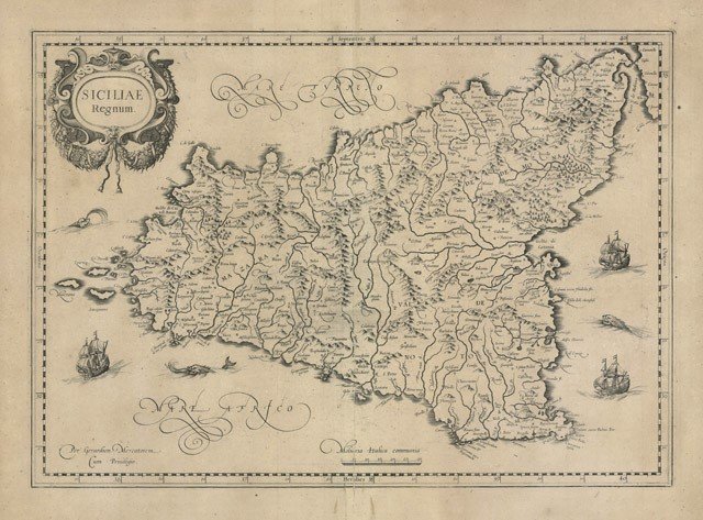Edizione a cura di Jannsonius che nella realizzazuìione del suo "Theatrum Italiae", per illustrare la Sicilia si avvalse del rame del 1589 realizzato da Mercatore. Questo venne interamente modificato a partire dal cartiglio, nell'angolo in alto a sinistra, fino alle ondulazioni a tratteggio del mare del tutto scomparse al cui posto vengono inseriti vascelli e mostri marini. L'impianto topografico e onomastico rimane sostanziale lo stesso e sulla matrice permane anche l'antico imprint editoriale "Per Gerardum Mercatorem Cum Privilegio". Piega centrale editoriale con rinforzo nella parte inferiore. Complessivamente ottimo esemplare di questa rara edizione