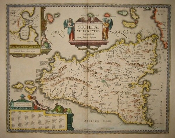 Incisione originale su rame (cm. 48x38 più ampi margini) edita da J.Janssonius. Bella coloritura all’acquarello. Ottimo esemplare.