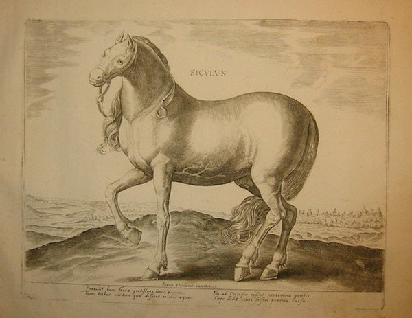 Incisione originale su rame (cm. 26x20 più ampi margini bianchi) pubblicata da Philippe Galle nell’opera ‘Equile Ioannis Austriaci Caroli V. Imp. F. In quo omnis generis generosissimorum equorum ex varijs orbis partibus insignis delectus’, le cui incisioni sono da attribuire alla mano di H. Wierix, Heindrick Goltzius e Adriaen Collaert. Carta vergellata con filigrana. Ottimo esemplare stampato in controparte. Rara. Cfr. A. Baroni Vannucci, ‘Jan Van Der Straet detto Giovanni Stradano.’, pp. 366 e ss.