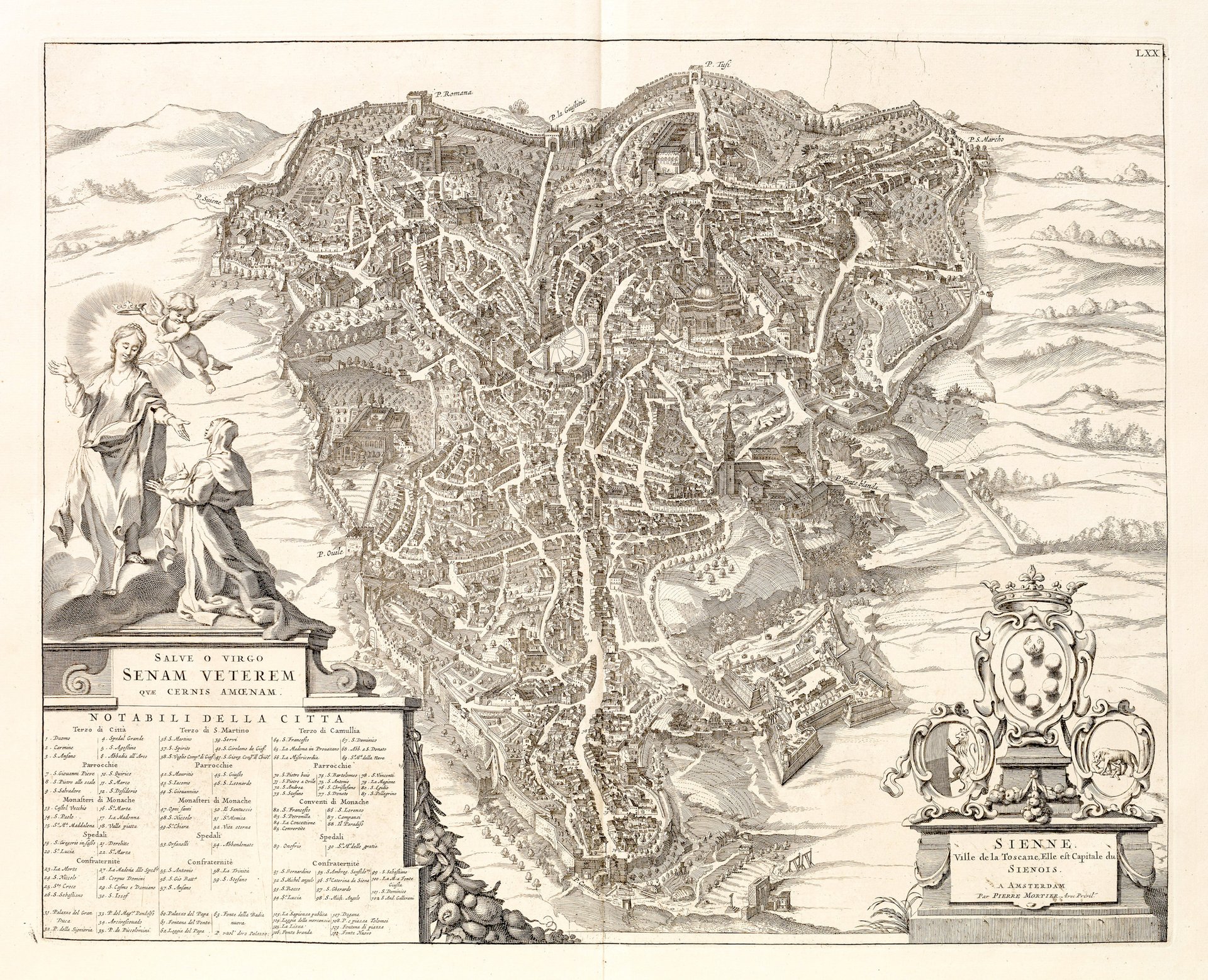 Incisione in rame, mm 500x595. Splendida pianta prospettica tratta da “Nouveau théâtre d'Italie”. Pierre Mortier (1661-1711) fu un editore assai attivo ad Amsterdam agli inizi del XVIII secolo: tra le sue principali fatiche si annovera la ristampa del “Theatrum Civitatum…Italiae” di Blaeu con l’aggiunta originale di un quarto volume, relativo a nord Italia e Toscana. Allo stesso modo, Alberts apportò modifiche e inserì la sua impronta su molte mappe. Splendido esemplare, tracce usuali di pieghe editoriali, assai marginoso, con una traccia in inchiostro bruno di una spilla.Invia<BR>