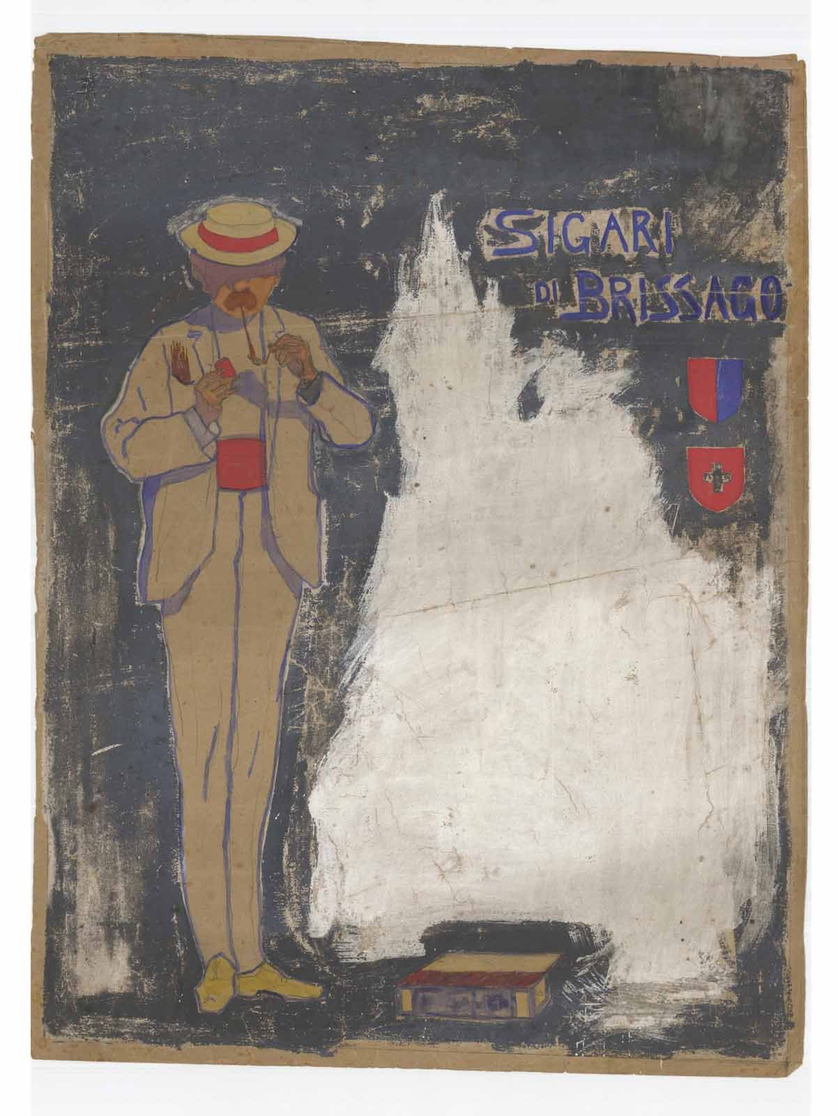 Bozzetto originale realizzato a tecnica mista, acquerello e tempera, per pubblicizzare i sigari di Brissago prodotti in Canton Ticino sulle sponde del lago Maggiore. L’uomo, sulla sinistra, è raffigurato mentre si accende un sigaro lungo e stretto, molto in voga a metà dell’Ottocento, chiamato Virginia dal luogo di provenienza delle foglie di tabacco che successivamente sarà ribattezzato sigaro di Brissago. Durante il periodo risorgimentale, poco prima dei moti rivoluzionari che portarono all’Unità d’Italia, alcuni seguaci di Mazzini, per sfuggire all’Impero Austriaco, dalla Lombardia passarono in Canton Ticino trovando rifugio ed ospitalità nella cittadina di Brissago che in breve tempo divenne crocevia per i traffici di merci di contrabbando e luogo di scambio delle nuove idee liberali. All’epoca il Virginia era prodotto dalla Imperial Regia Manifattura Austriaca dei Tabacchi e così, gli esuli assieme alla borghesia brissaghese decisero di fondare, in territorio libero e neutrale una fabbrica di tabacchi in diretta concorrenza con quella di Venezia. Fu così che il 29 aprile del 1847 nacque la Fabbrica Tabacchi di Brissago. Il bozzetto si presenta in buono stato di conservazione generale fatta eccezione per alcuni strappetti marginali professionalmente restaurati.