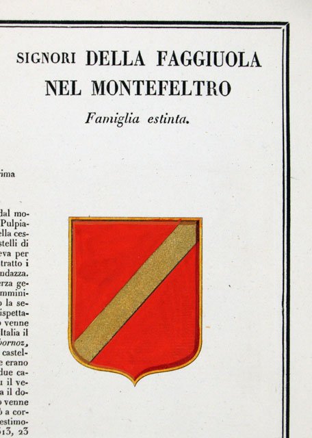 Fascicolo che raccoglie le vicende genealogiche della famiglia con stemma miniato all'epoca contenente 1 tavola di testo e 4 di incisioni di cui 3 con personaggi miniati