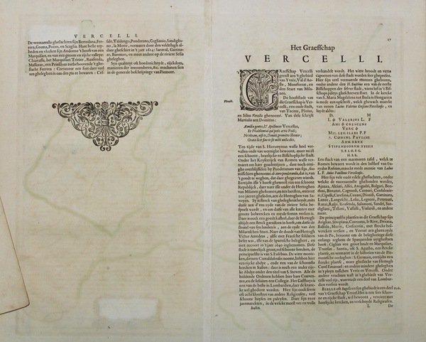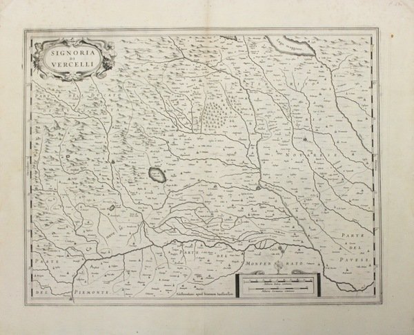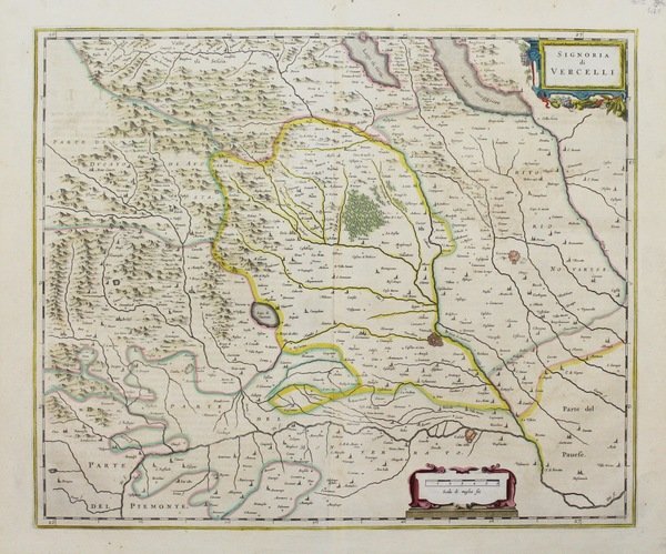 Incisione in rame, colorata d'epoca, 410x490. W. Blaeu, astronomo allievo di Tycho Brahe, fondò un'officina per la costruzione di globi nel 1599; quasi immediatamente iniziò a pubblicare anche carte geografiche, giungendo nel 1630 alla creazione del primo atlante "Atlantis Appendix" e cinque anni dopo, della prima edizione in due tomi del "Atlas Novus". Dopo la sua morte nel 1638, a cura del figlio Johan si giunse nel 1662 alla pubblicazione del celebre "Atlas Maior" in 11 volumi. Nel 1672 un incendio distrusse l'officina e segnò la fine dell'attività. Ottimo esemplare su carta leggermente ingiallita.