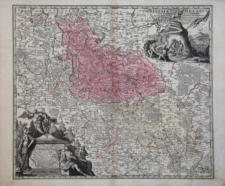 Carta geografica della Slesia pubblicata da Mattheus Seutter. La Slesia o Silesia è una regione storica dell'Europa centrale, appartenente oggi per la maggior parte alla Polonia e in misura minore alla Repubblica Ceca e alla Germania. Il Ducato di Slesia fu creato nel 1138 in seguito alla disgregazione della Polonia in singole aree parziali dopo la morte del Duca Boles?aw III.In basso a sinistra troviamo, in un bel cartiglio decorativo, la pianta di Breslavia. Matthäus Seutter (1678 - 1757) fu uno dei più importanti e prolifici editori tedeschi di mappe del XVIII secolo. Attivo, come incisore sotto la tutela dell'importante J. B. Homann. All'inizio del 1700 Seutter lasciò Homann per tornare ad Augusta, dove lavorò per l'importante editore d'arte Jeremia Wolff (1663 - 1724), per il quale incise mappe e altre stampe. Intorno al 1717 fondò la propria casa editrice cartografica indipendente ad Augusta. La maggior parte delle mappe di Seutter sono pesantemente basate, se non addirittura copie, di lavori precedenti fatti dalle calcografie Homann e De L'Isle. Ciononostante, dal 1731/32 Seutter era uno degli editori più prolifici del suo tempo e fu onorato dall'imperatore tedesco Carlo VI che gli diede il titolo di Geografo Imperiale, dopo il quale la maggior parte delle mappe successive includeva la denominazione ' Avec Privilege. ' Seutter continuò a pubblicare fino alla sua morte, all'apice della sua carriera, nel 1757. Incisione in rame, coloritura coeva, in ottimo stato di conservazione. Silesia antique map, copperplate engraved and hand colored included a decorative title cartouche and a military image.The Duchy of Silesia was created in 1138 as a result of the disintegration of Poland into individual partial areas after the death of Duke Boles?aw III. Today mostly belonging to Poland and to a lesser extent to the Czech Republic and Germany. Mattha?us Seutter (1678 - 1757) was one of the most important and prolific German map publishers of the 18th century. Seutter was born the son of a goldsmith but apprenticed as a brewer. Apparently uninspired by the beer business, Seutter abandoned his apprenticeship and moved to Nuremberg where he apprenticed as an engraver under the tutelage of the prominent J. B. Homann. Sometime in the early 1700s Seutter left Homann to return to Augsburg, where he worked for the prominent art publisher jeremiad Wolff (1663 - 1724), for whom he engraved maps and other prints. Most of Seutter's maps are heavily based upon, if not copies of, earlier work done by the Homann and De L'Isle firms. Nonetheless, by 1731/32 Seutter was one of the most prolific publishers of his time and was honored by the German Emperor Karl VI who gave him the title of Imperial Geographer, after which most subsequent maps included the Avec Privilege designation. Copperplate with fine original colouring, very good condition. Cfr.