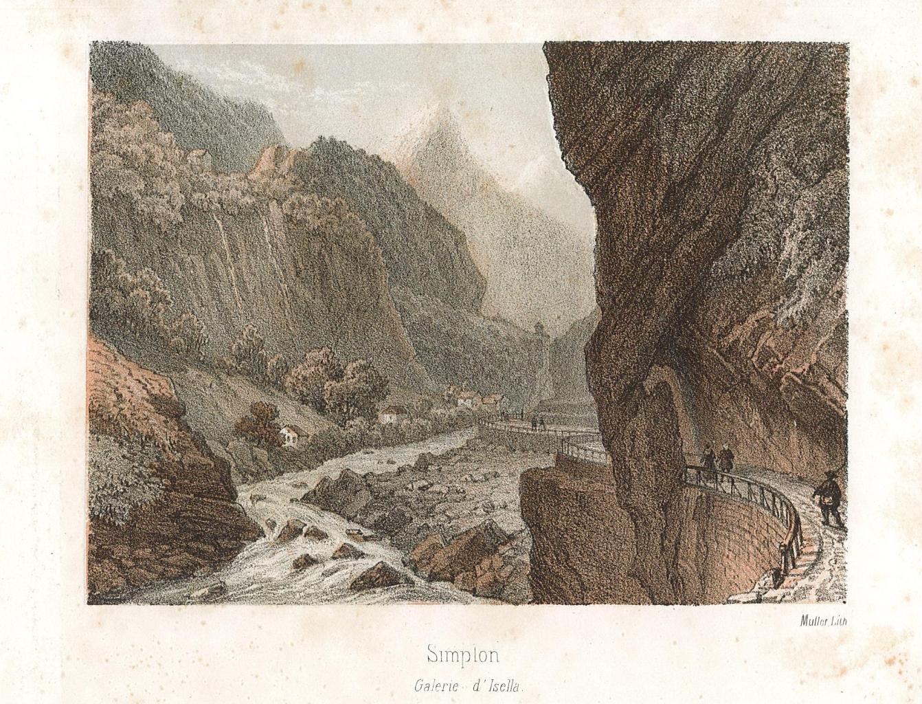 Veduta, antica ed originale, della valle de Sempione. Litografia stampata a colori pubblicata a Parigi dalla Litografia Lemercier. Autore: Muller Lit. Luogo: Sempione - Iselle. Anno: 1840 ca. Tecnica: litografia. Dimensioni: 100x135 mm