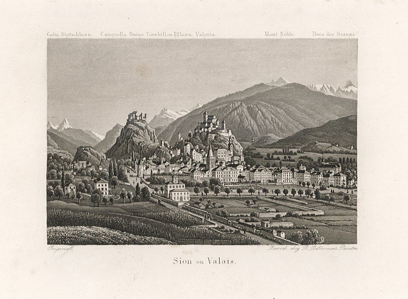 Stampa, antica ed originale, raffigurante la cittadina diSion in raffinata acquatinta. Inserita nell'opera "Souvenir de la Suisse" edita a Zurigo. Autore: Dikenmann Rudolf dis. (1793 Zürich 1883). Luogo: Sion - Vallese. Anno: 1860 ca. Tecnica: acquatinta. Dimensioni: 74x112 mm
